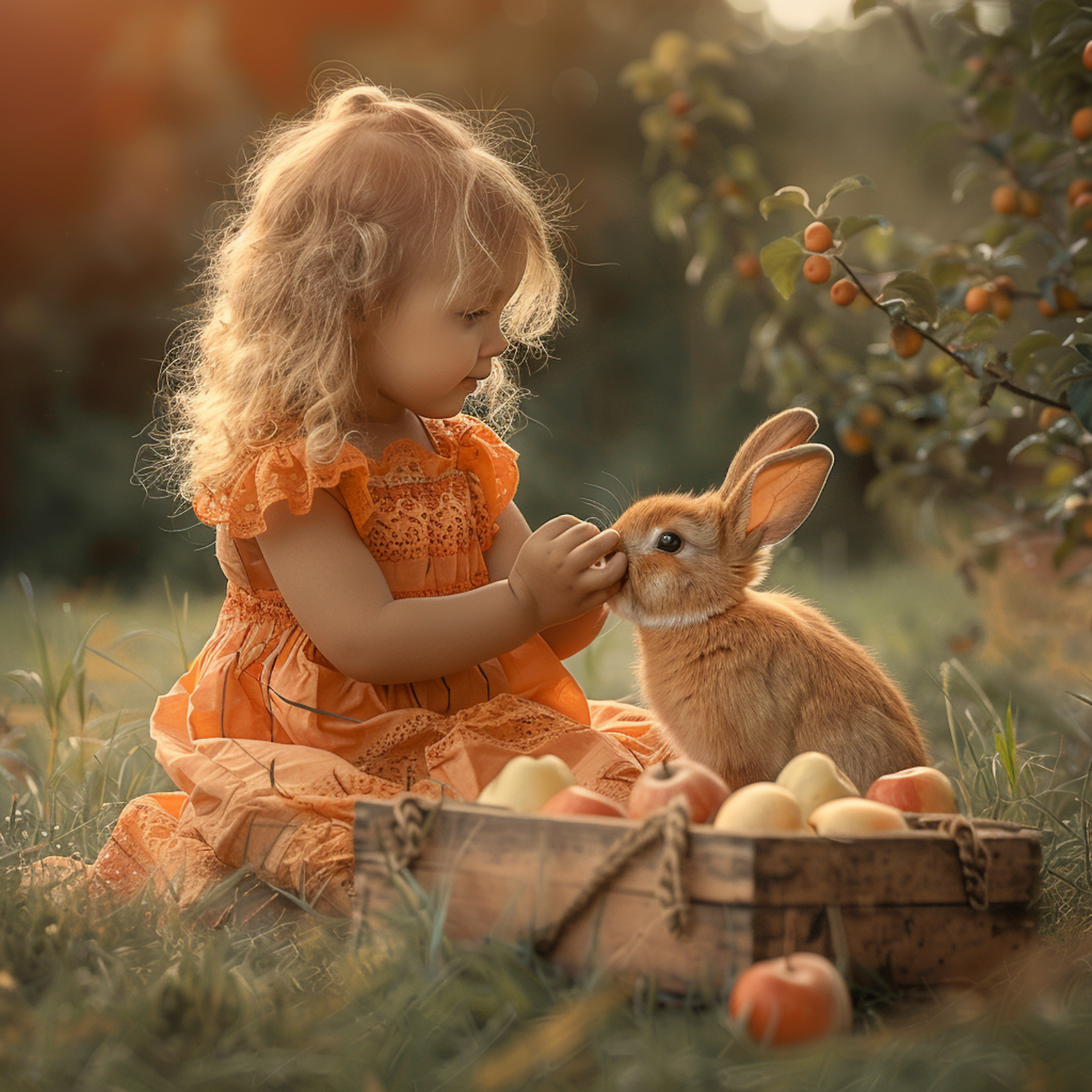 A young child in an orange dress gently touches a rabbit's nose, surrounded by apples in a serene garden setting.