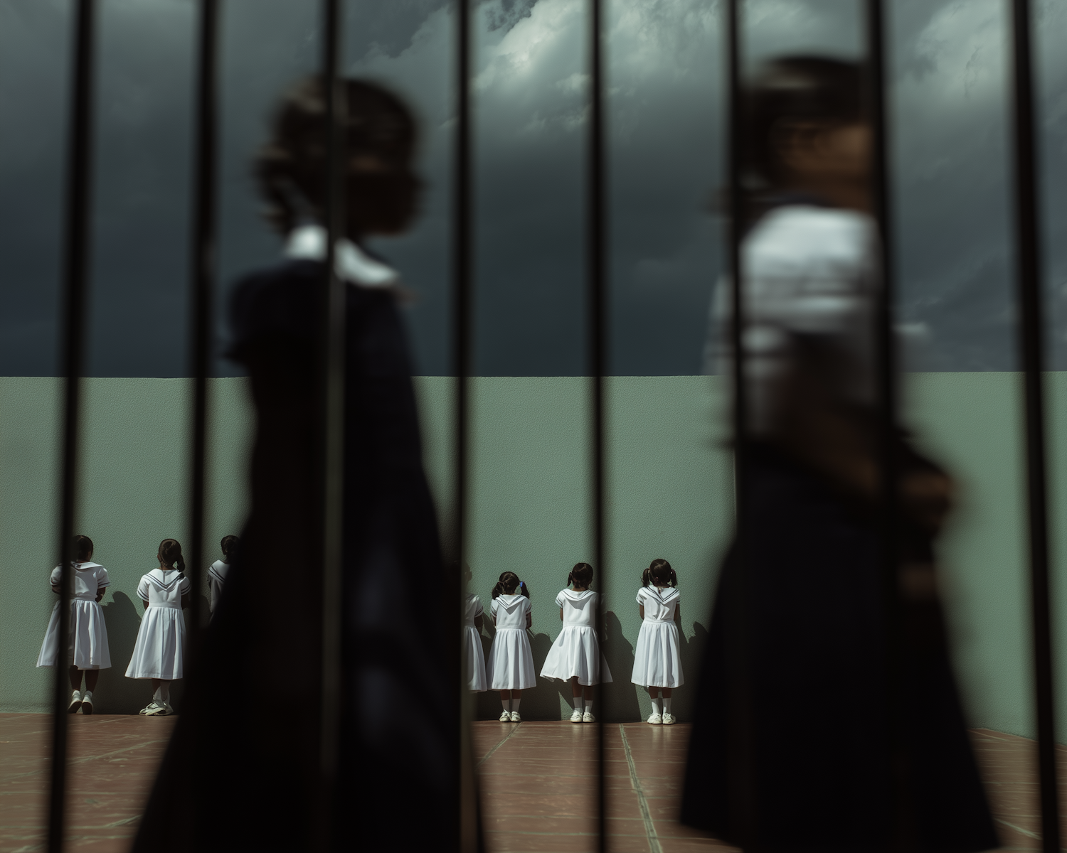 A group of girls in white dresses stand against a green wall under a cloudy sky, with blurred figures and bars in the foreground.