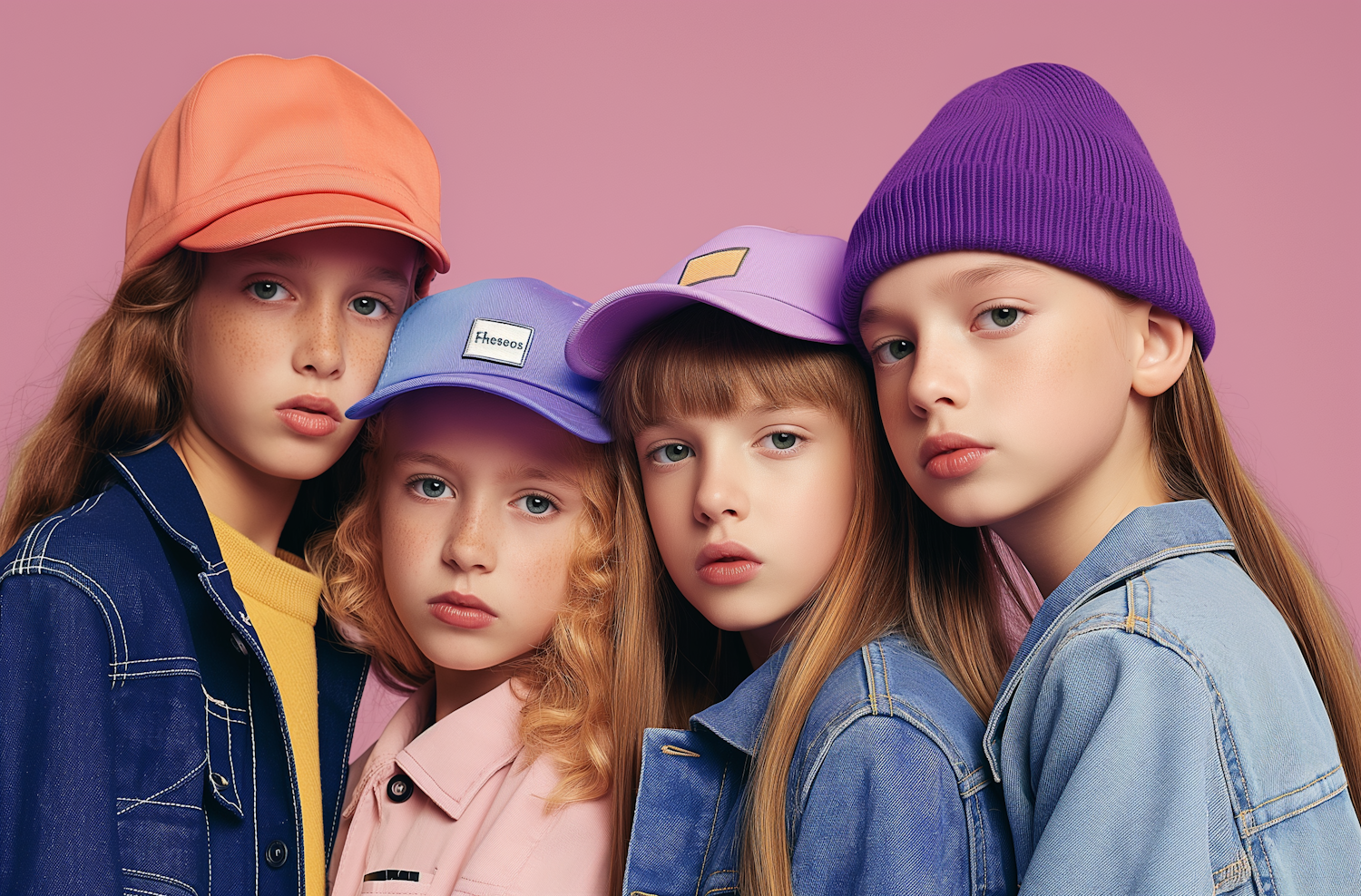 Four young girls in colorful hats and casual outfits pose against a pink background, showcasing vibrant fashion and unique styles.