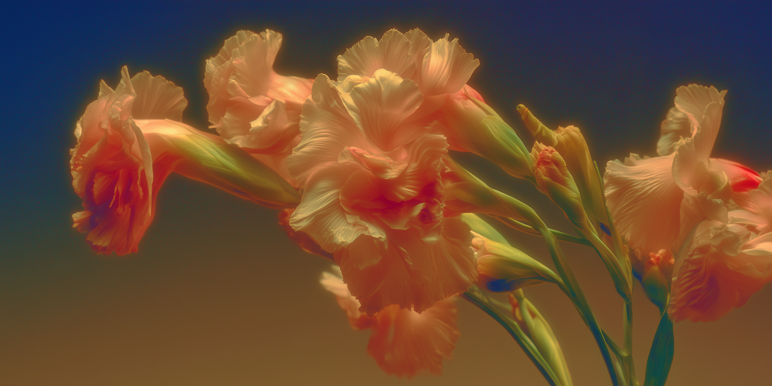 A close-up of peach gladiolus flowers with ruffled petals, glowing under warm light against a gradient blue and golden background.