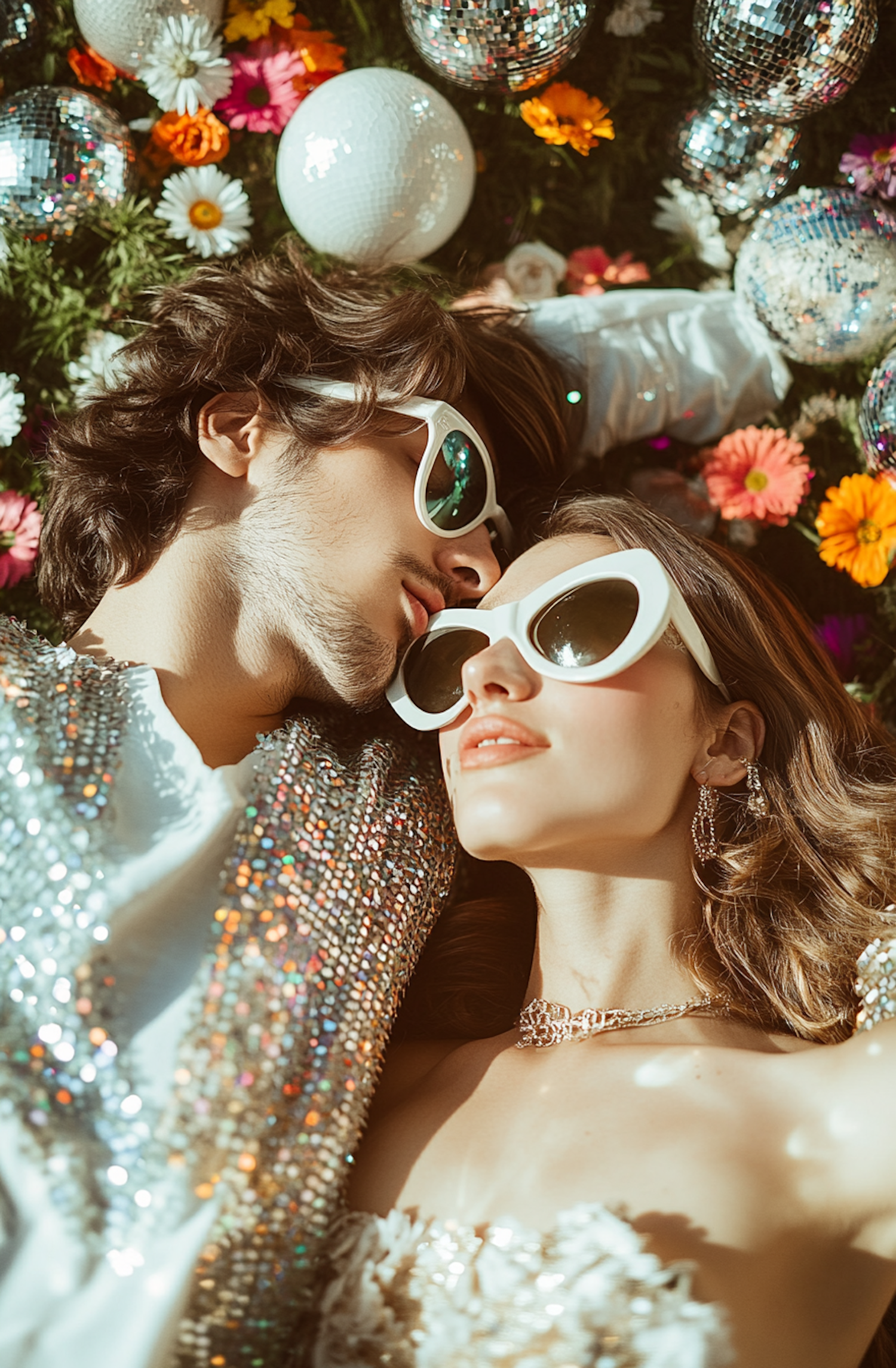 Stylish couple in white sunglasses lying on flowers and disco balls, exuding retro glamour and vibrant elegance.