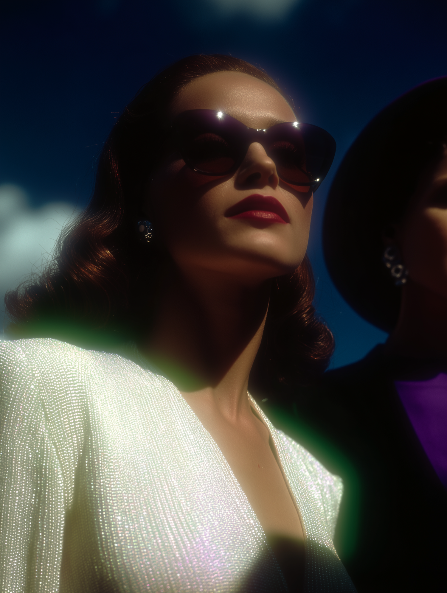 Stylish woman in sunglasses and a shimmering outfit under dramatic lighting, with a deep blue sky and a hint of another figure in the background.