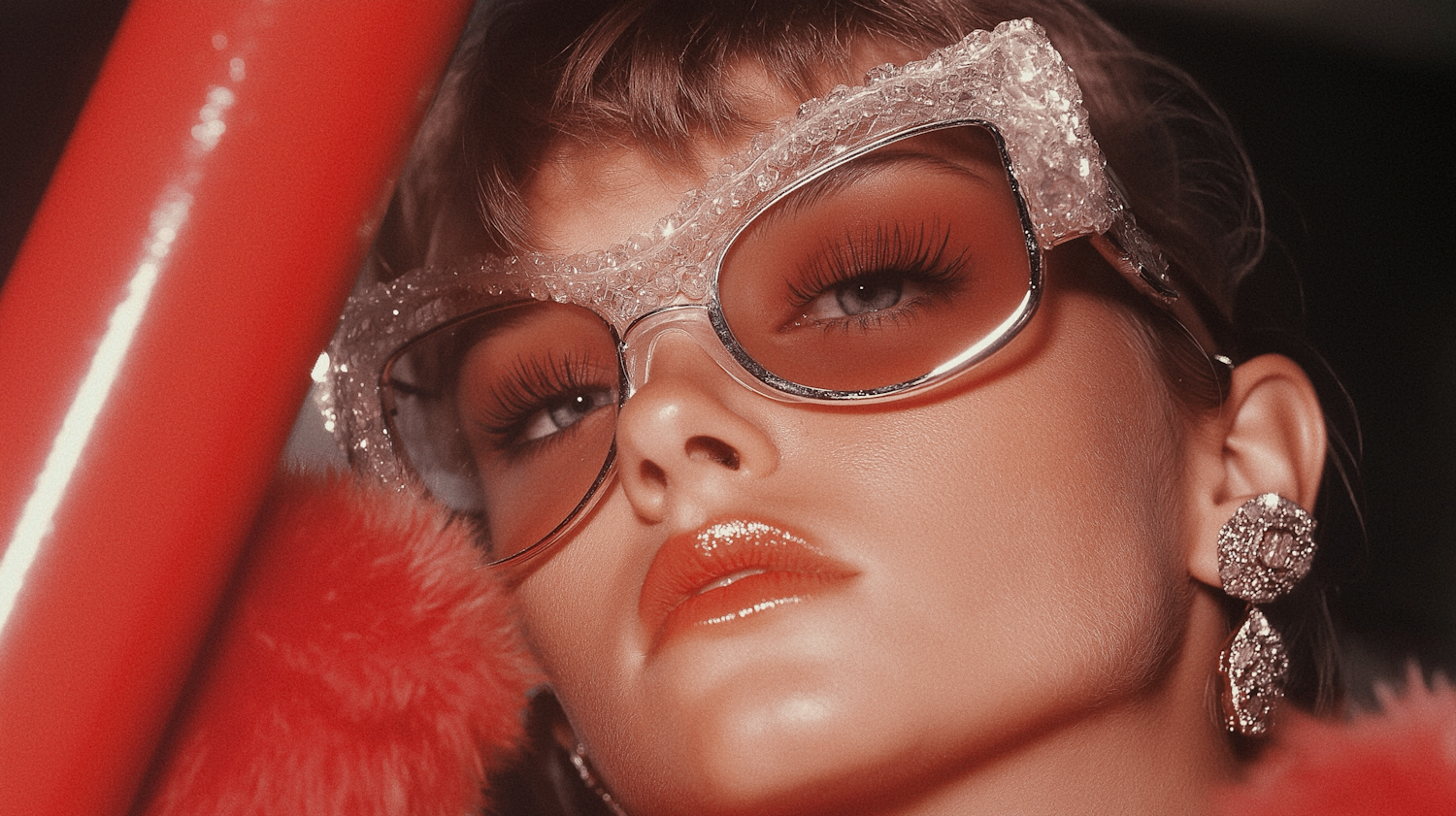 Glamorous close-up of a woman with crystal sunglasses, red lips, and sparkling earrings, exuding confidence and style.