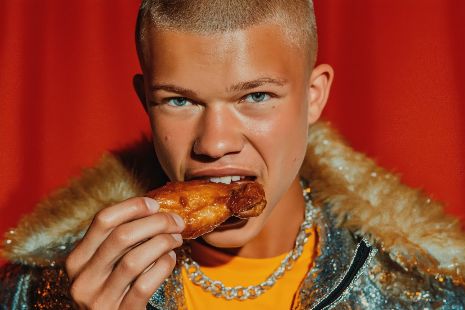 A stylish individual enjoys a glazed chicken wing, wearing a sequined jacket with a fur collar against a bold red background.