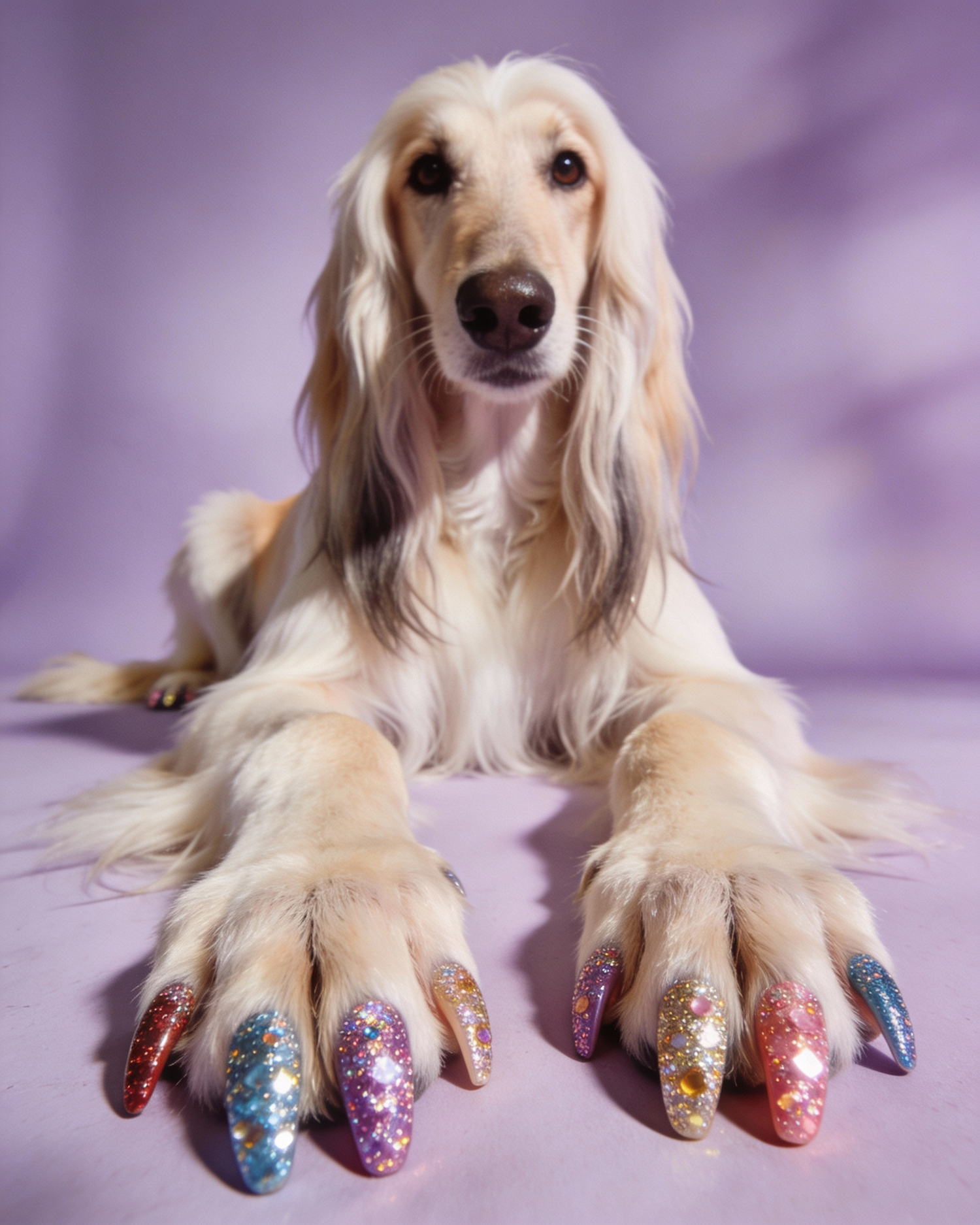 An afghan hound dog in a striking cute pose with glitter fake nails shot on a light purple studio.