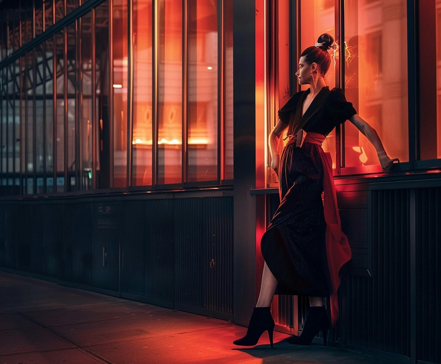 Elegant woman in black dress with red belt poses against a glass building, bathed in warm orange-red light, exuding sophistication.