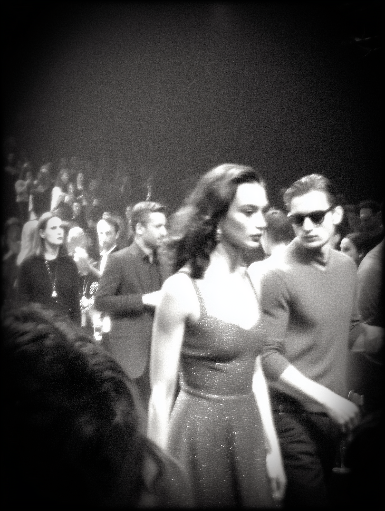 Black-and-white image of a glamorous event with elegantly dressed individuals, featuring a woman in a sparkling dress and a man in sunglasses.