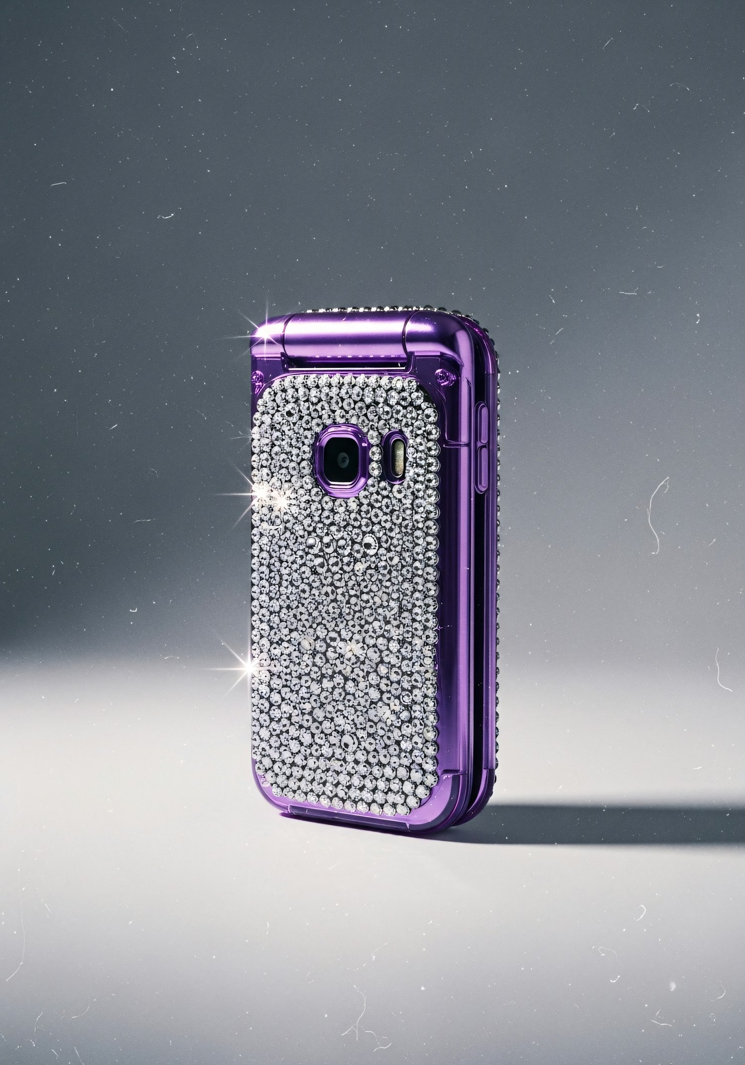 A purple flip phone with a rhinestone-encrusted back, blending retro design with modern glam. Perfect for those who love bold accessories.
