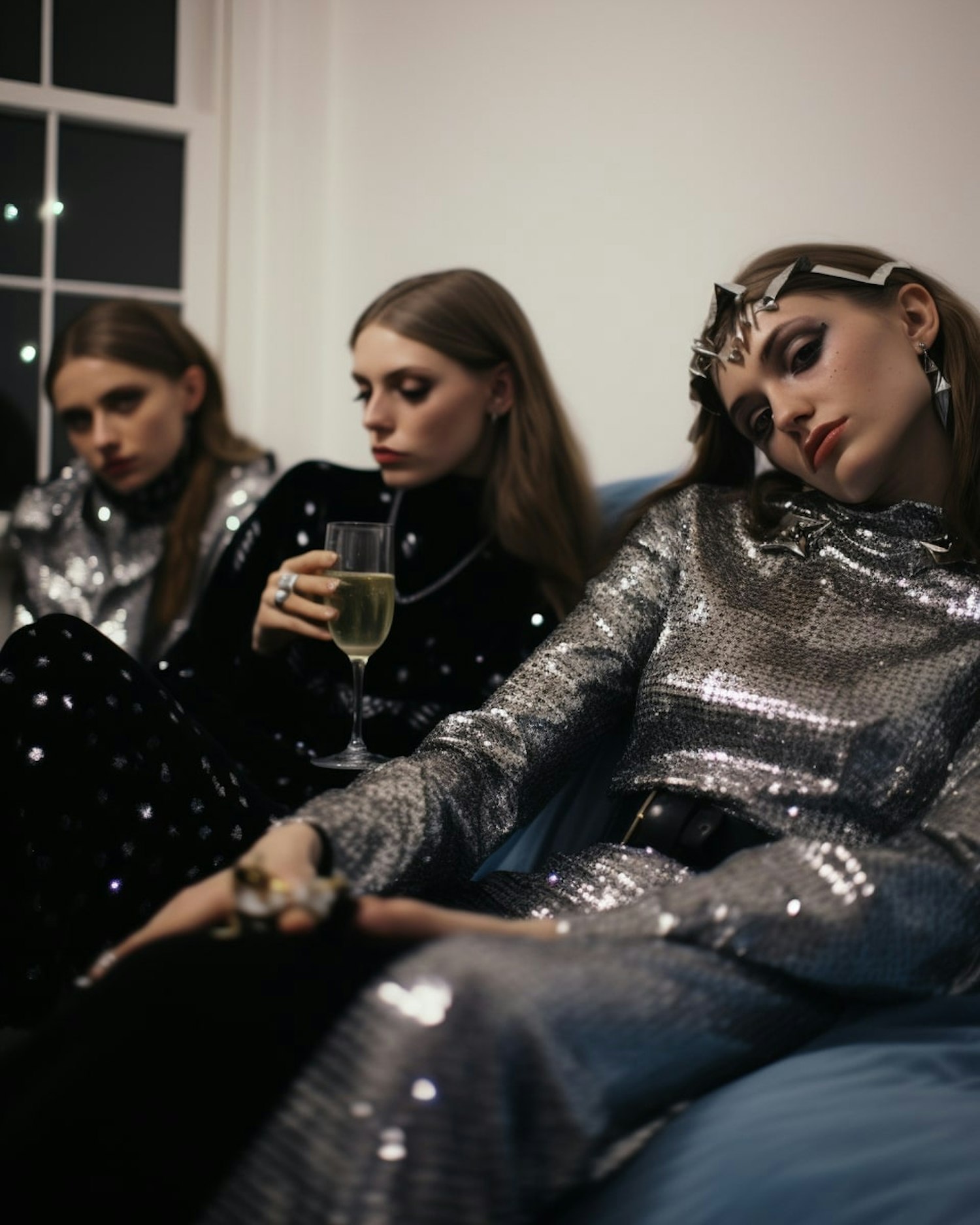 Three women in shimmering silver and black outfits, seated together, exude elegance and sophistication at a glamorous event.