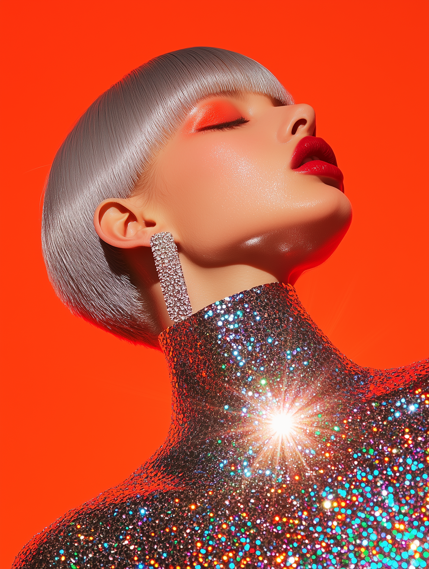 Futuristic glam with silver hair, bold orange eyeshadow, and sparkling sequins against a vivid orange backdrop.