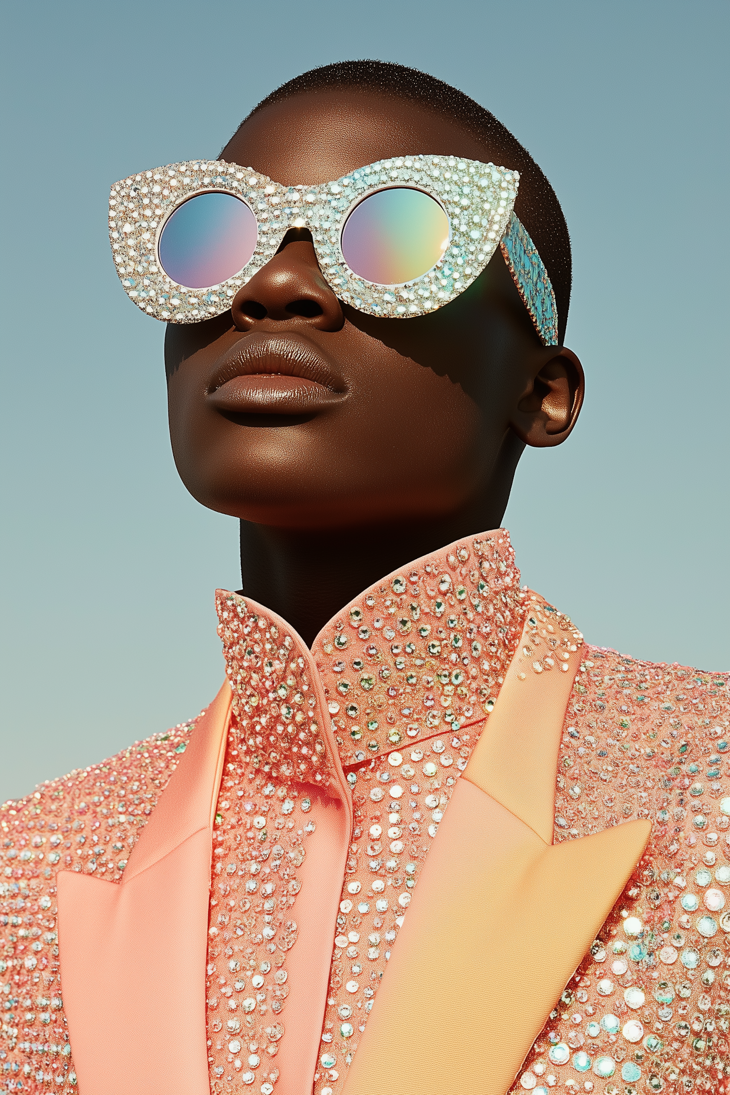 High-fashion portrait of a person in a rhinestone-studded peach suit and crystal-encrusted sunglasses against a clear blue sky.