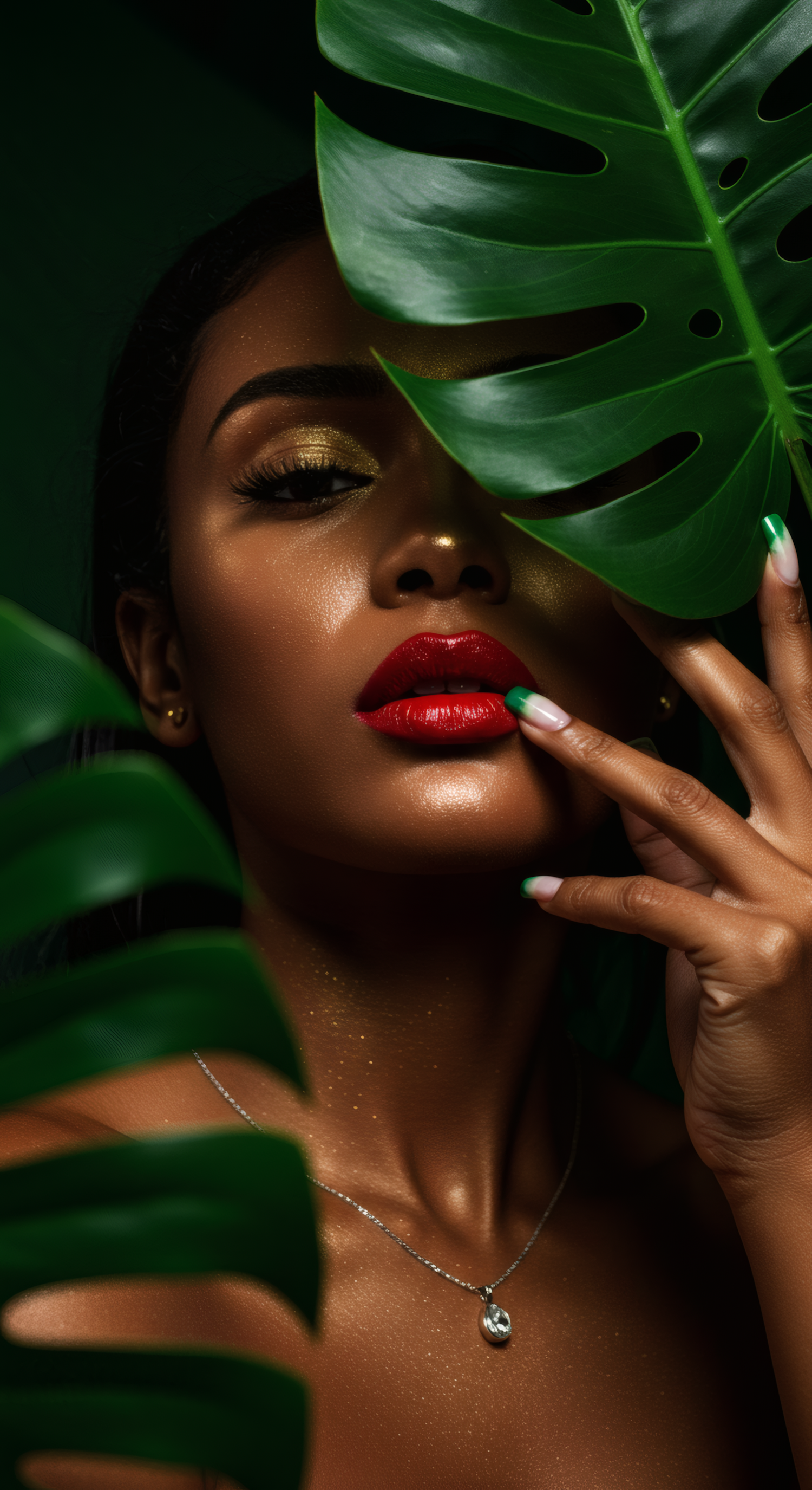 Elegant portrait of a woman with bold makeup, red lips, and green leaves. Striking contrast and natural beauty.