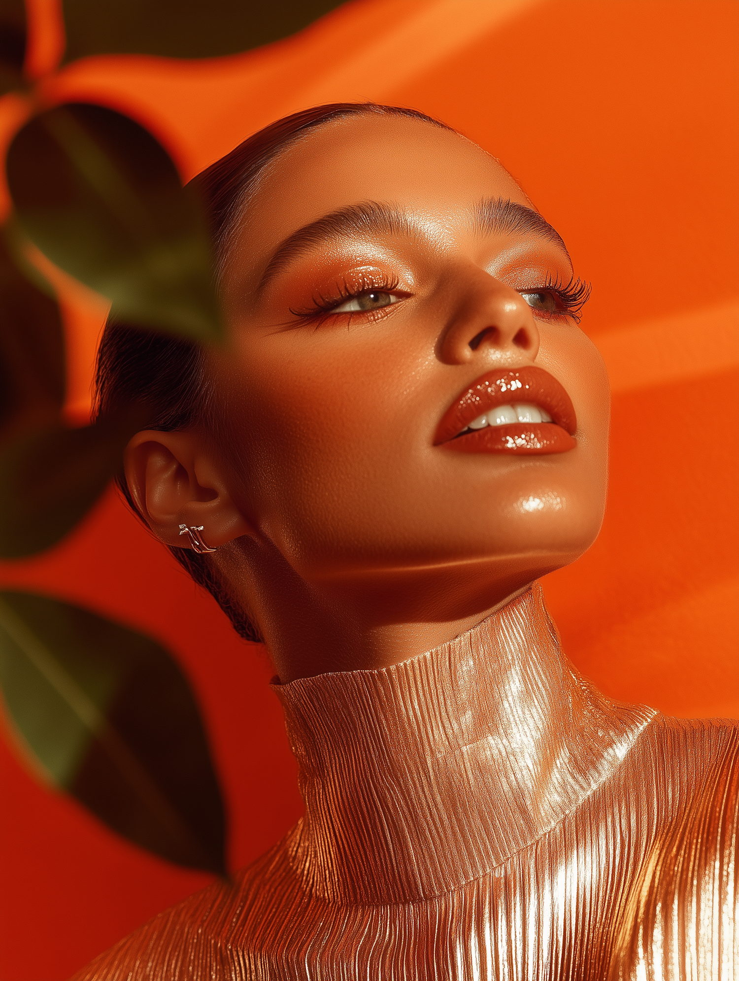 A woman with glossy lips and shimmering eyeshadow in a metallic top against a vibrant orange background, with green leaves in the foreground.