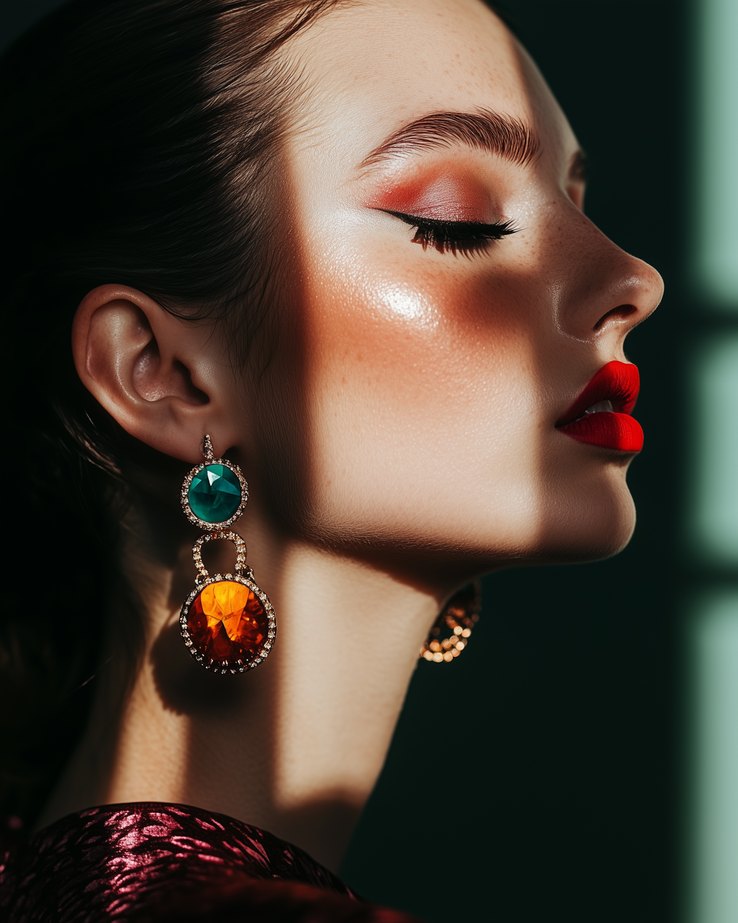 Elegant close-up of a woman with bold makeup, vibrant earrings, and dramatic lighting highlighting her sharp profile.