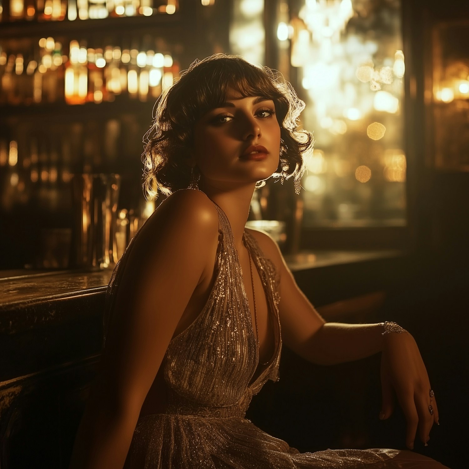 Elegant woman in a shimmering silver gown sits at a dimly lit bar with warm golden lights, exuding vintage charm and sophistication.
