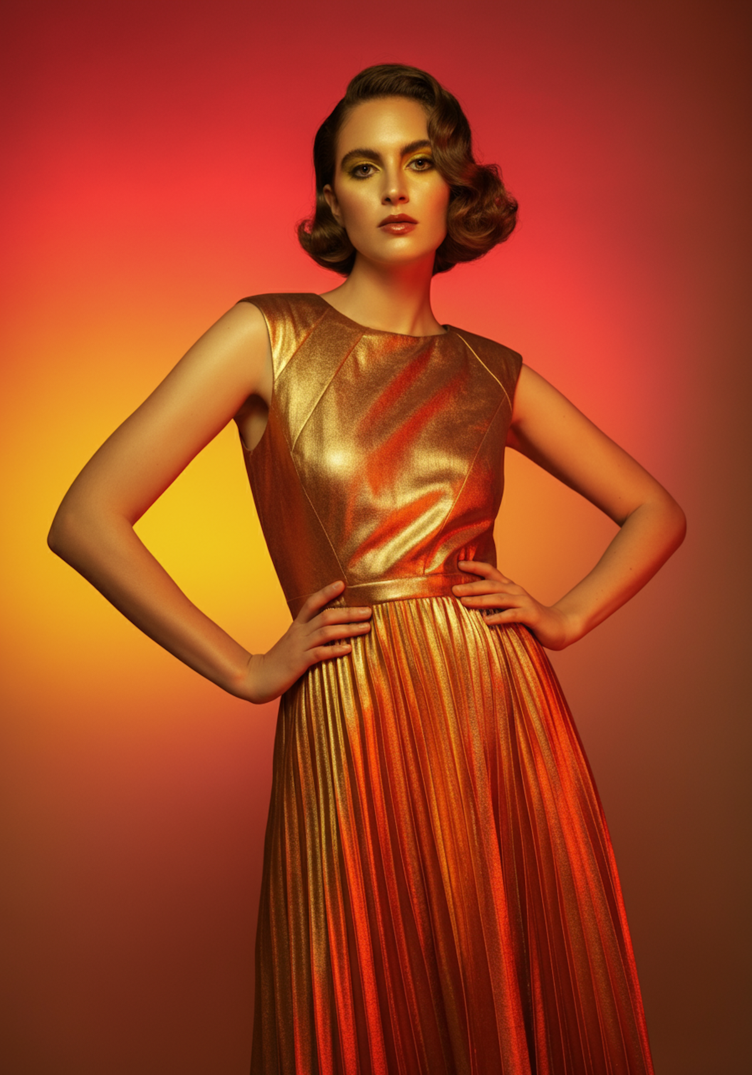Elegant woman in a shimmering gold dress with bold makeup against a warm red-orange gradient background.