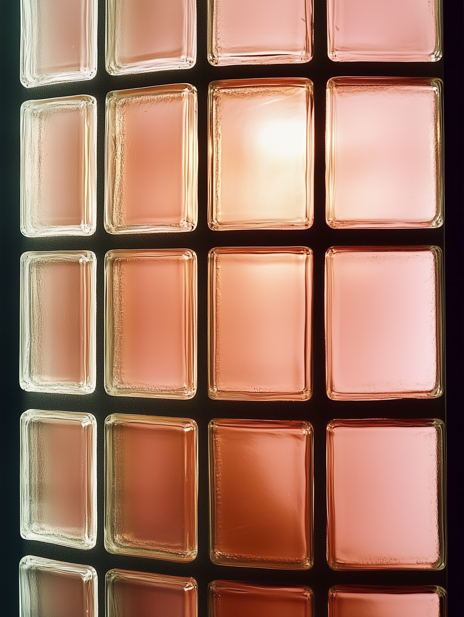 A vertical grid of glass blocks with warm pink and rose hues, reflecting light beautifully against a dark background.