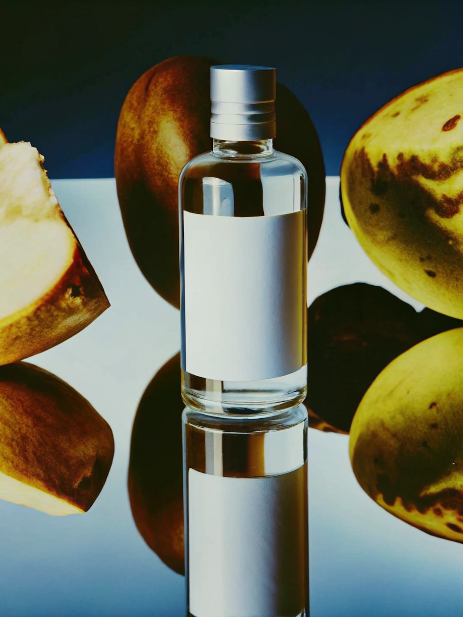 Minimalist glass bottle with blank label surrounded by ripe apples and pears on a reflective surface, perfect for organic product branding.