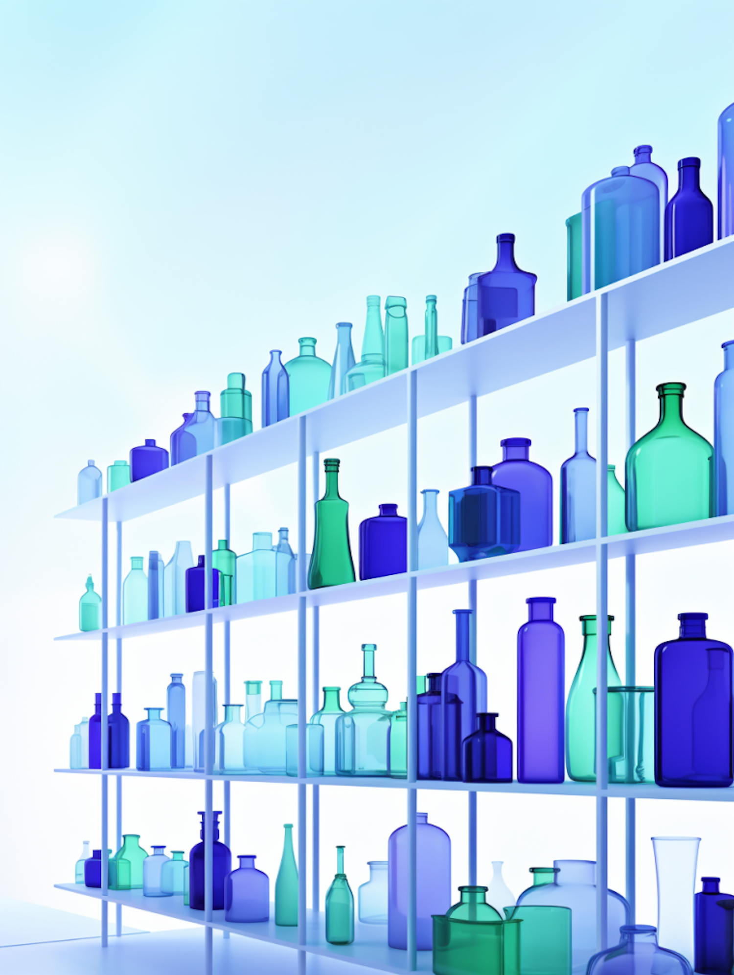 Colorful glass bottles on white shelves against a light blue background, creating a serene and minimalist aesthetic.