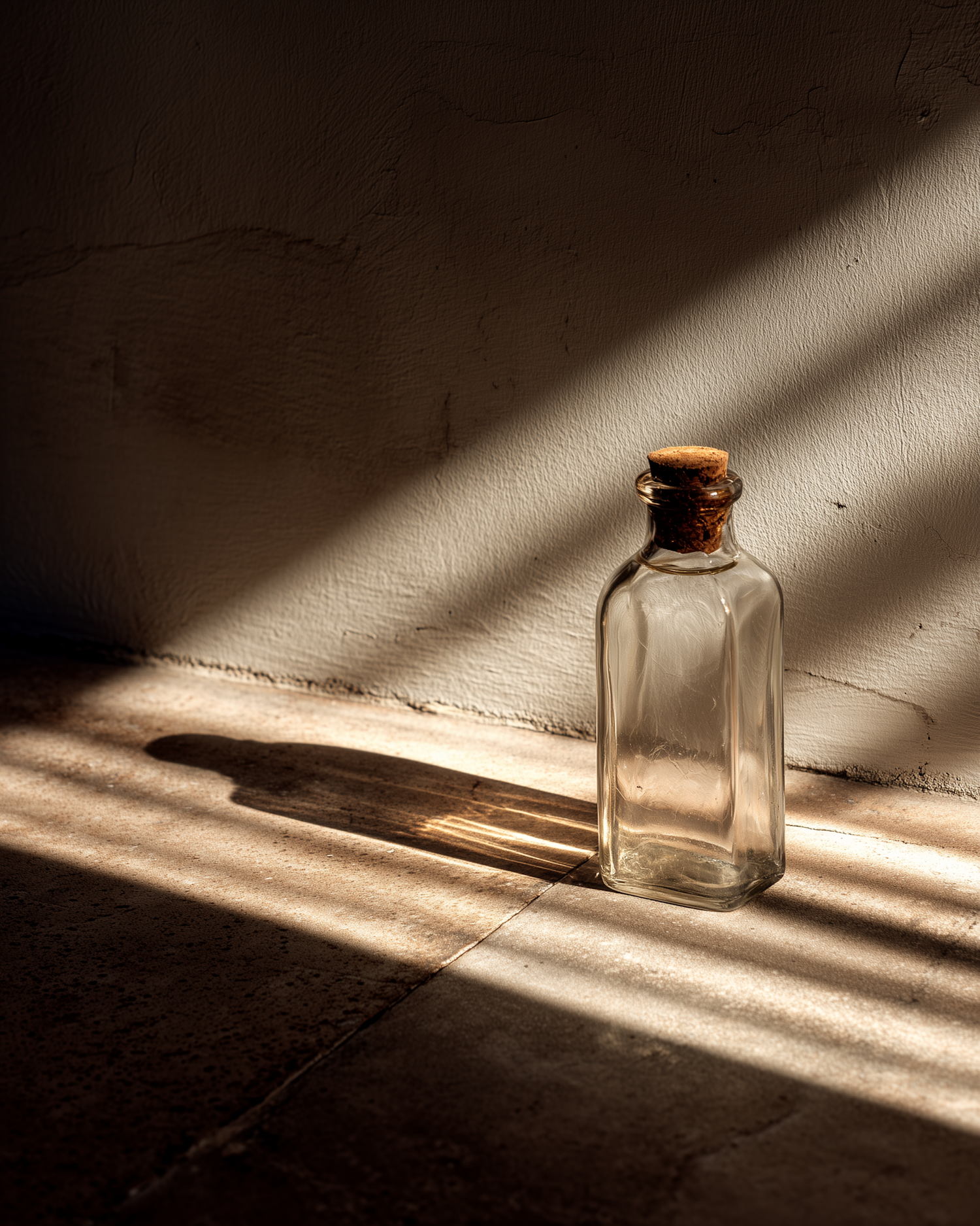 A glass bottle with a cork stopper sits in warm sunlight, casting intricate shadows on a textured surface, creating a serene composition.