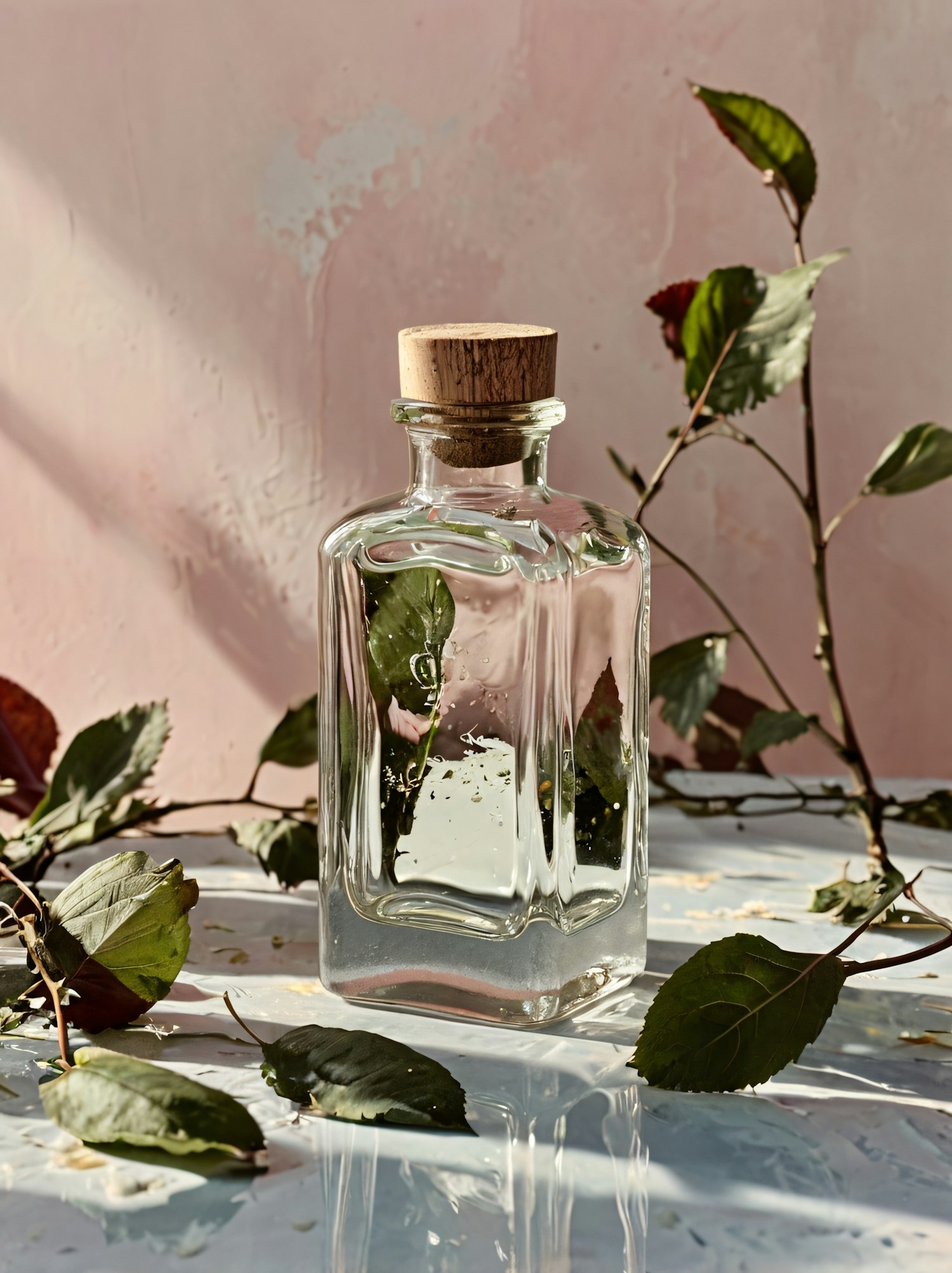 Minimalist glass bottle with wooden cork, surrounded by green leaves on a reflective surface, against a textured pink background.