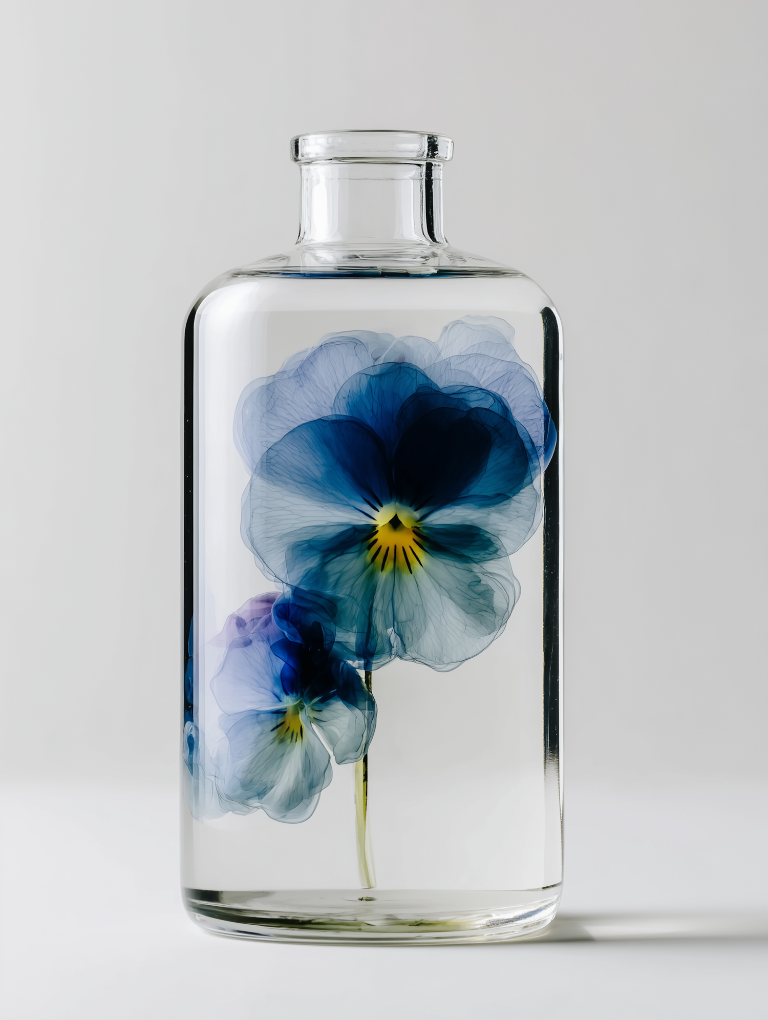 A clear glass bottle with vibrant blue and yellow pansy flowers suspended in liquid, set against a neutral background.
