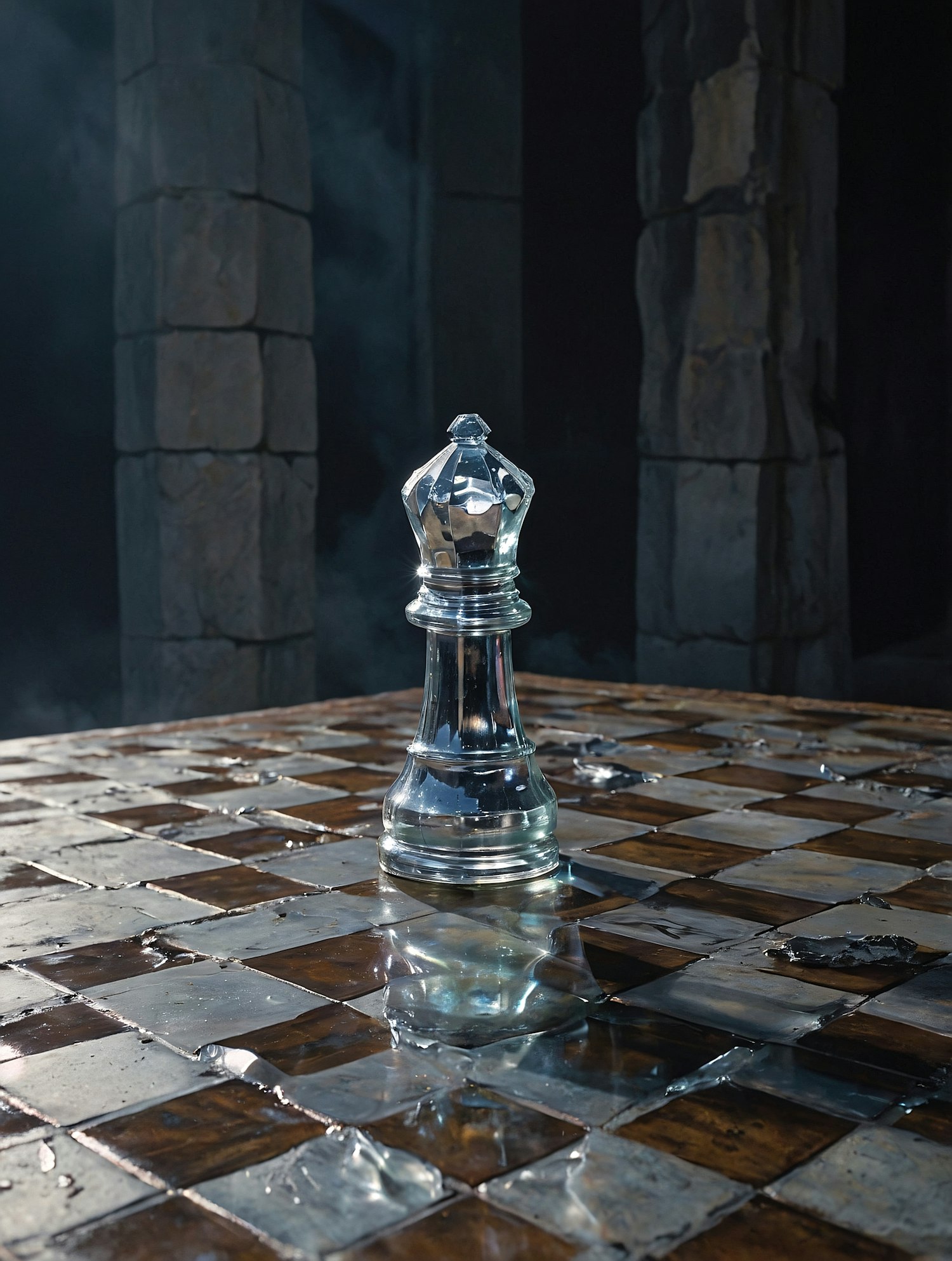 Glass chess queen on a reflective metallic chessboard with water droplets, set against a dimly lit stone pillar background.