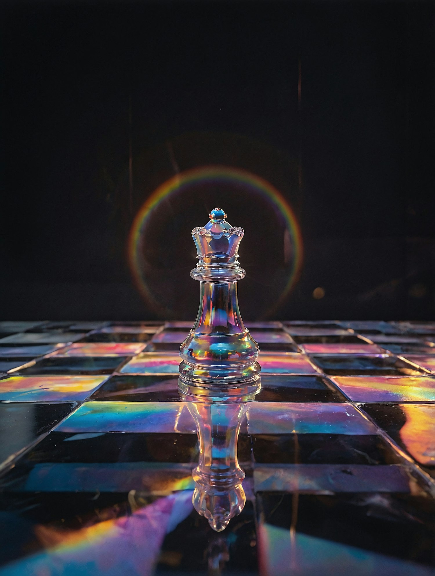 Glass chess queen on a colorful reflective board with a rainbow halo effect, set against a dark background.