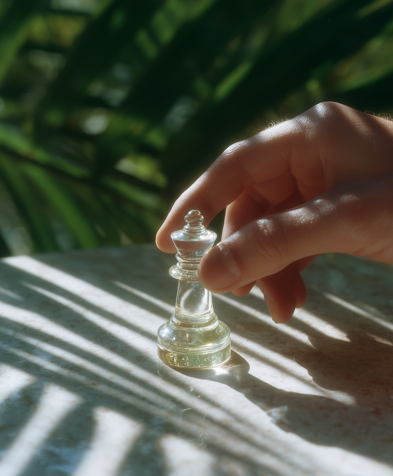 A hand holding a glass chess king on a sunlit surface, with shadows and greenery in the background creating a serene atmosphere.