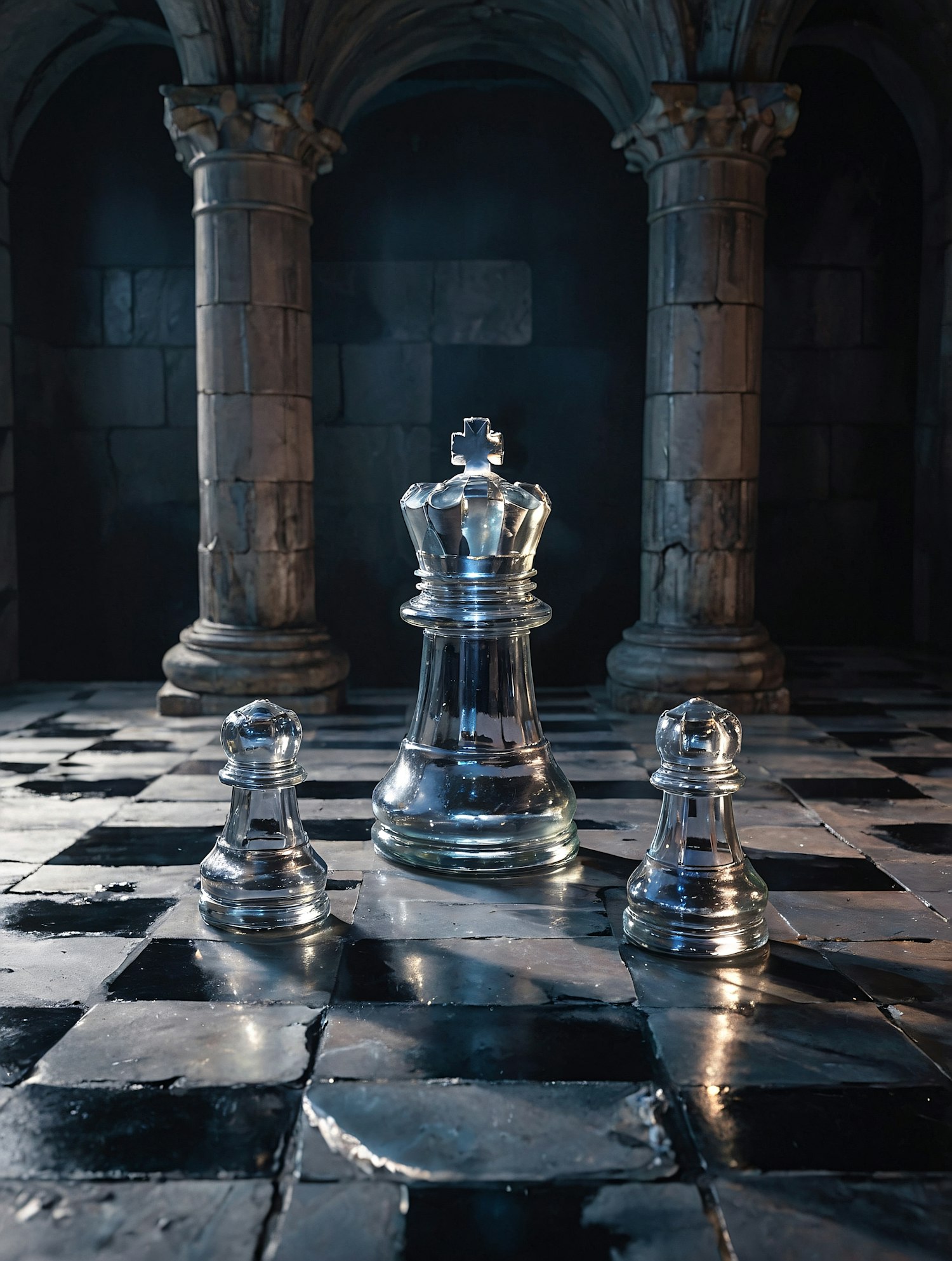 Glass chess pieces on a checkered floor in a dimly lit ancient hall with columns, creating a dramatic and mysterious atmosphere.