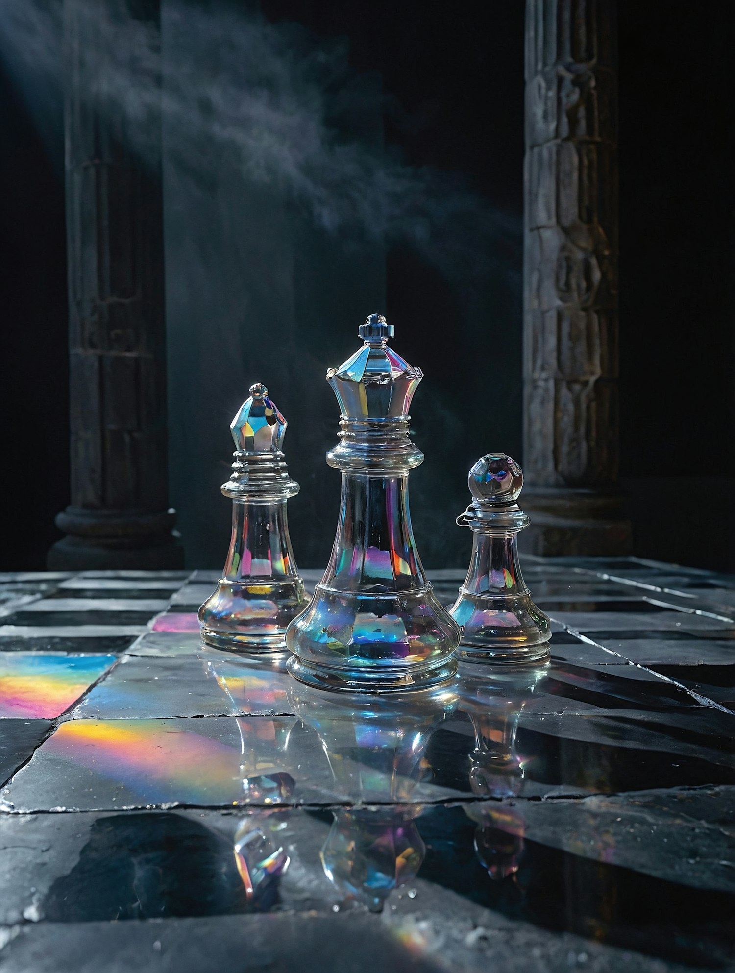Glass chess pieces on a reflective board with rainbow light refractions, set against a misty, columned background.