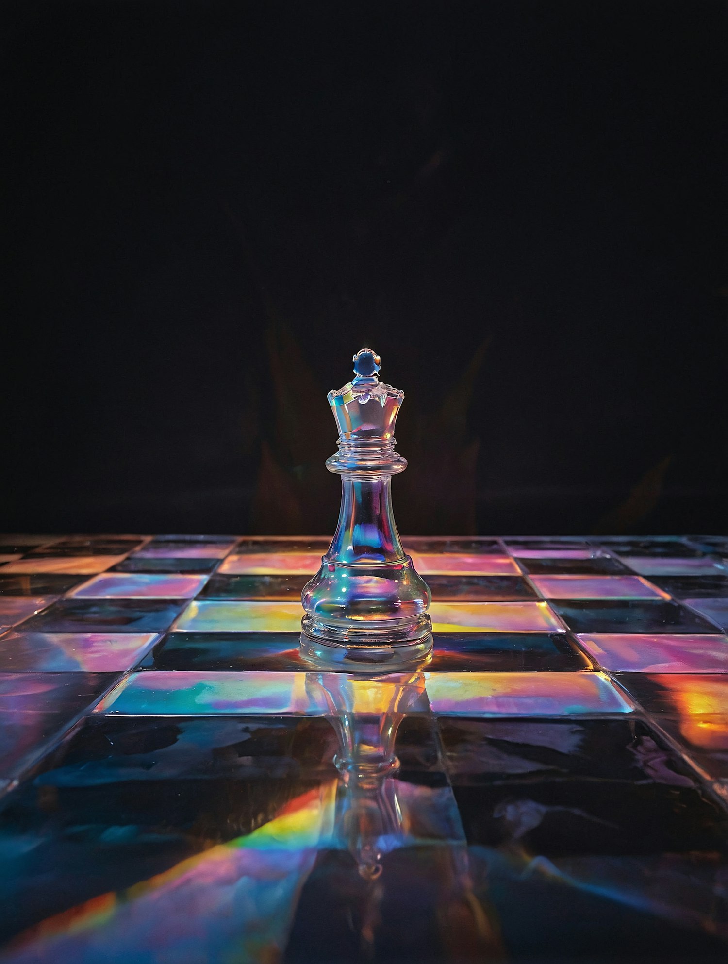 Glass chess queen on a vibrant, reflective board with iridescent colors against a dark background.