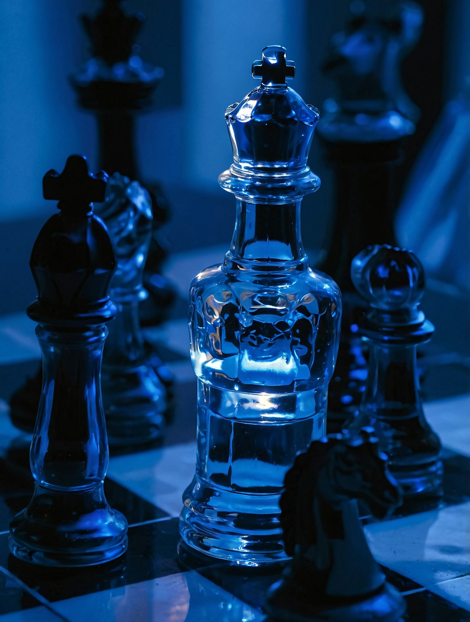 A glowing glass king chess piece surrounded by other pieces on a chessboard, illuminated by dramatic blue lighting.