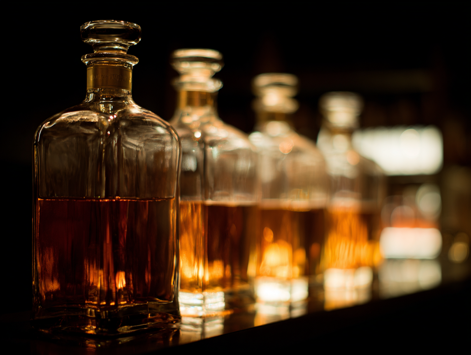 Close-up of glass decanters with amber liquid, arranged in warm lighting highlighting their clarity and elegant design.