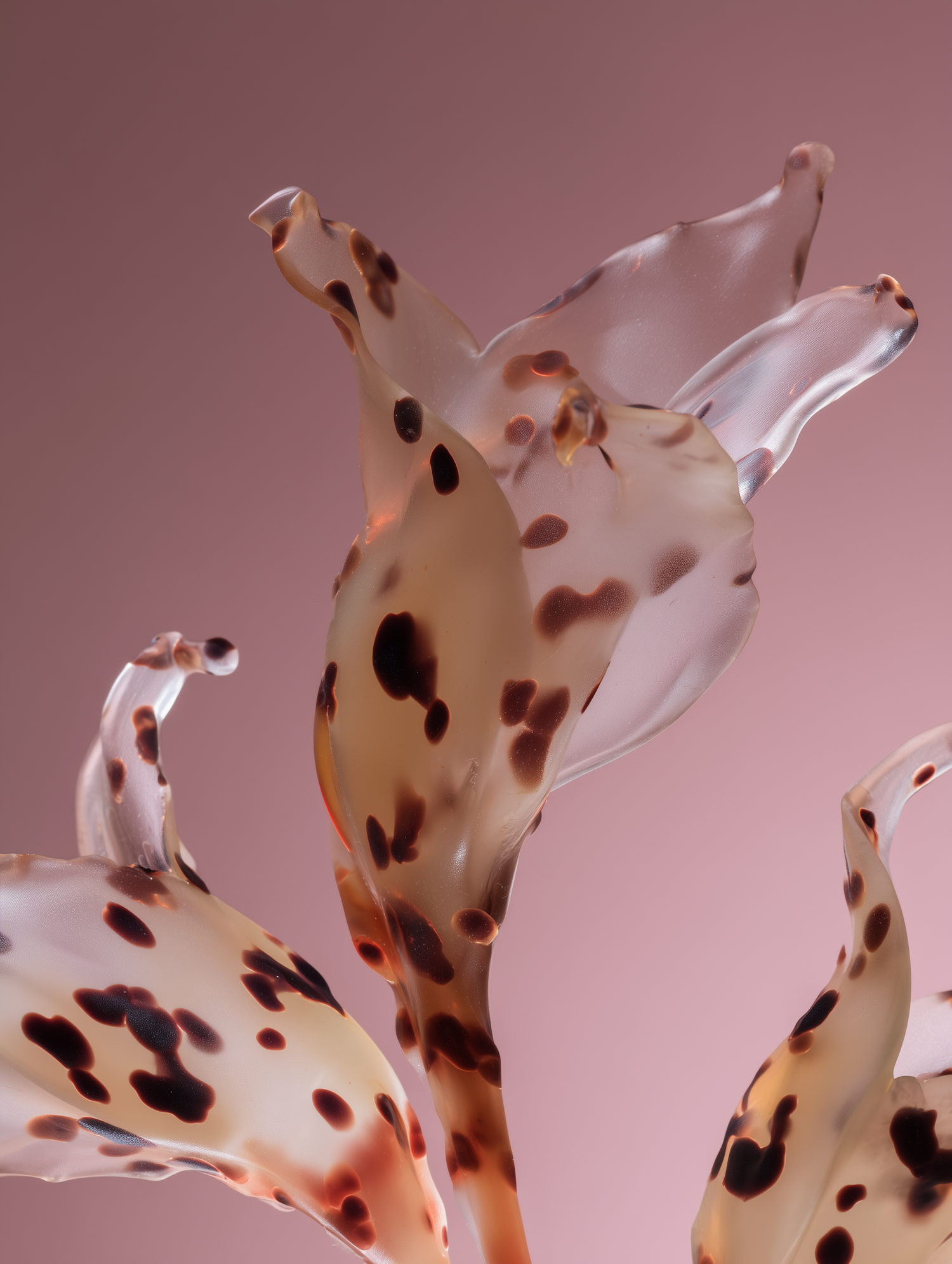 A close-up of a glass flower sculpture with spotted brown patterns on translucent petals, set against a soft pink background.