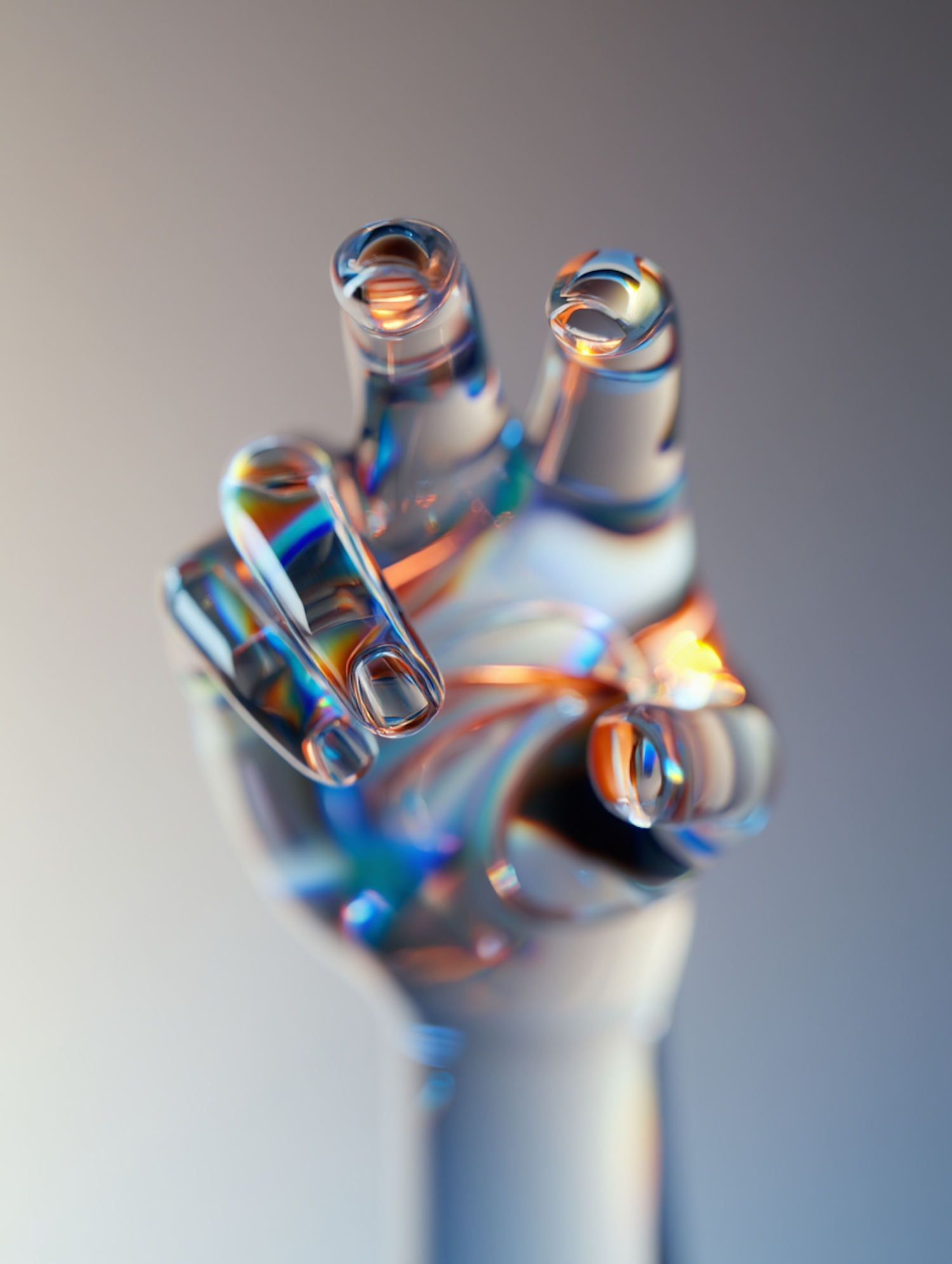 Translucent glass-like hand sculpture refracting light into vibrant colors, creating a modern and artistic visual effect.
