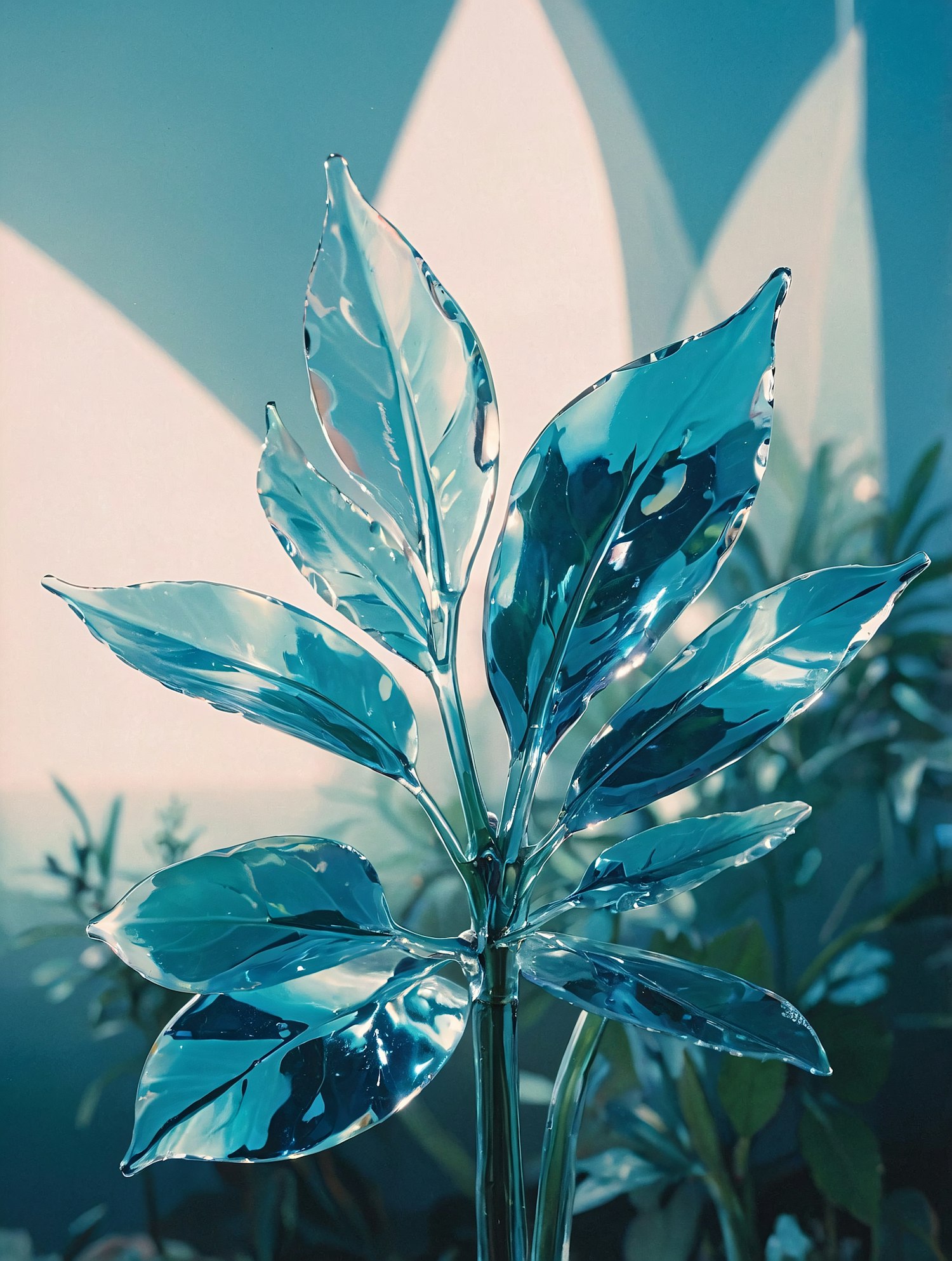 A stunning glass-like plant with translucent blue leaves reflecting light, set against a soft, abstract background.