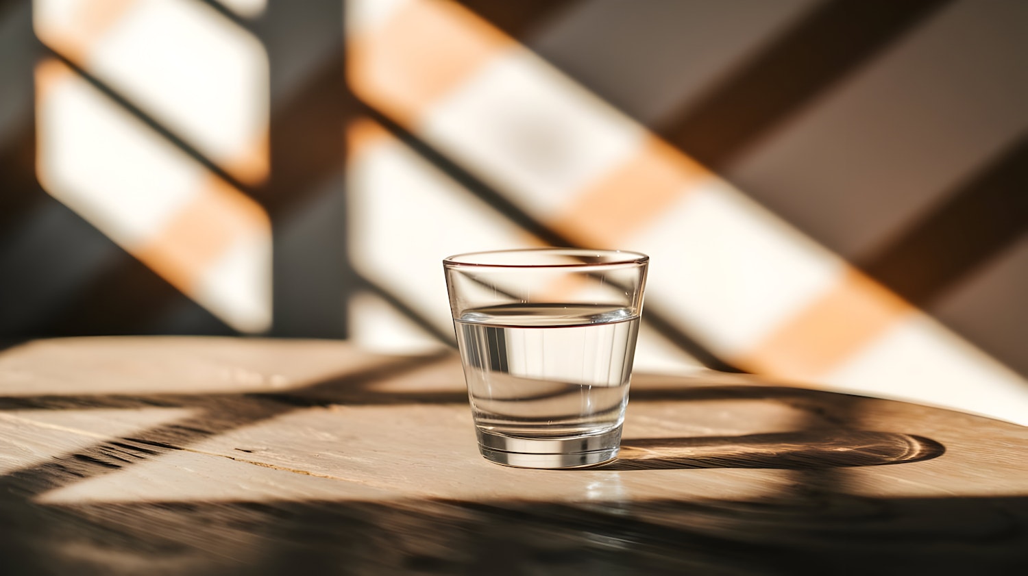 A glass of water on a wooden table with warm sunlight and diagonal shadows creating a serene, minimalist aesthetic.
