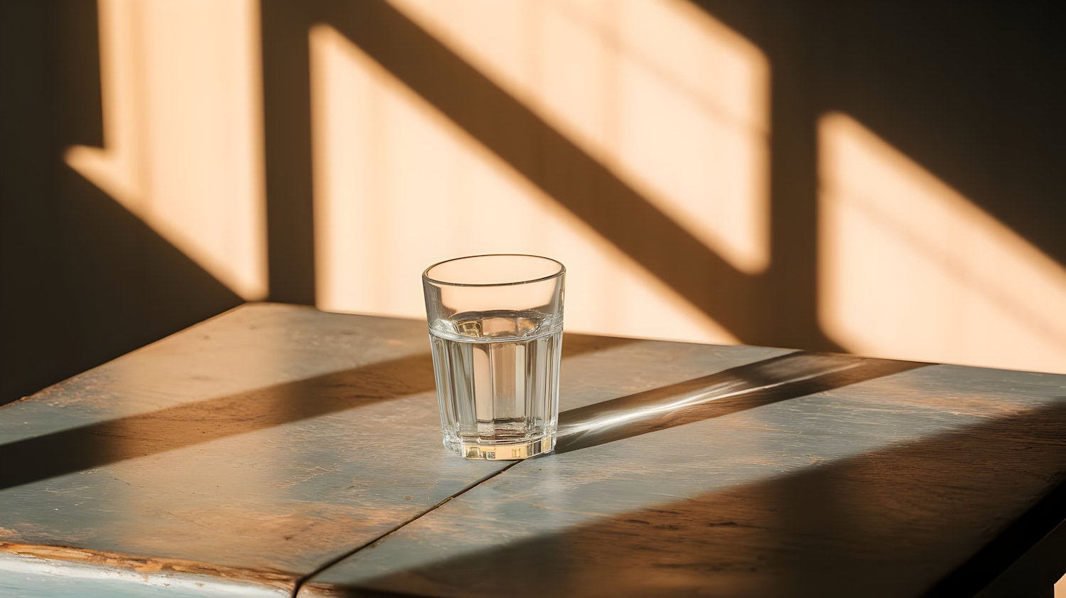 A glass of water on a rustic wooden table, illuminated by warm sunlight and geometric shadows. Minimalist and serene composition.