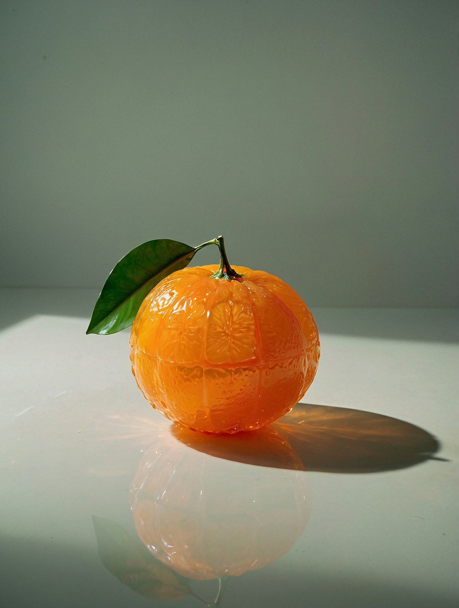 Glass sculpture of an orange with a green leaf on a reflective surface, casting a shadow and reflection. Elegant and vibrant art piece.