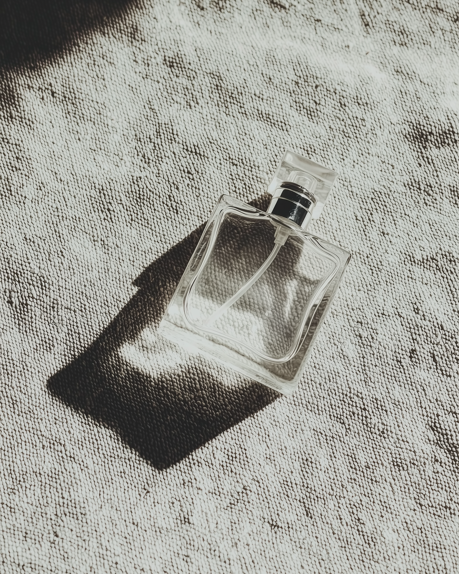 Minimalist clear glass perfume bottle on textured fabric, with dramatic natural light and shadow interplay for an artistic vibe.