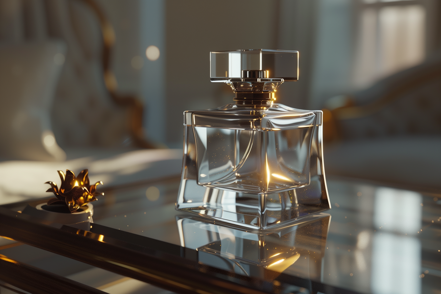 Elegant glass perfume bottle on a reflective table with a golden flower, exuding luxury and sophistication in soft lighting.