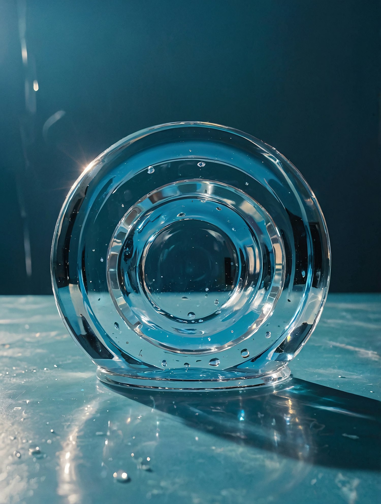 A transparent glass sculpture with concentric rings, sunlight reflections, and water droplets on a blue surface. Modern and artistic.