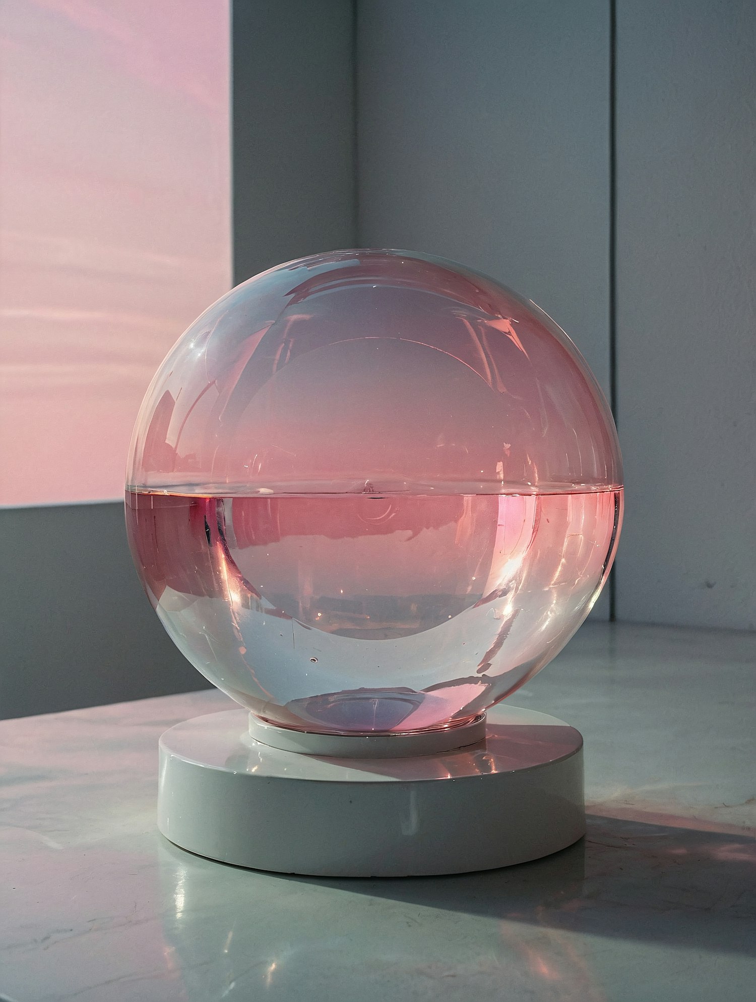 A glass sphere with pink liquid on a white base, set against a pastel pink sky and minimalist interior. Modern and serene aesthetic.