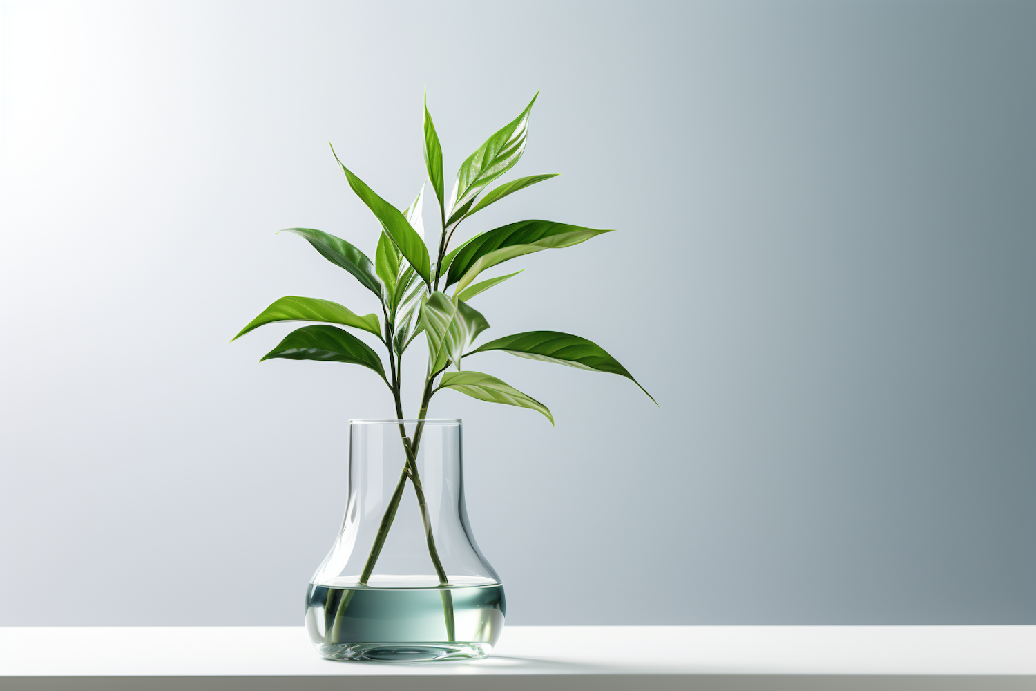 Minimalist glass vase with green leafy stems on a white surface, set against a soft gray gradient background.