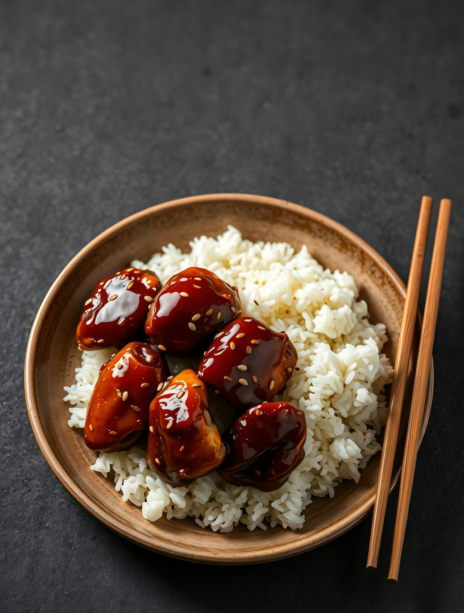Delicious teriyaki chicken with sesame seeds over fluffy white rice, served in a wooden bowl with chopsticks on a dark surface.