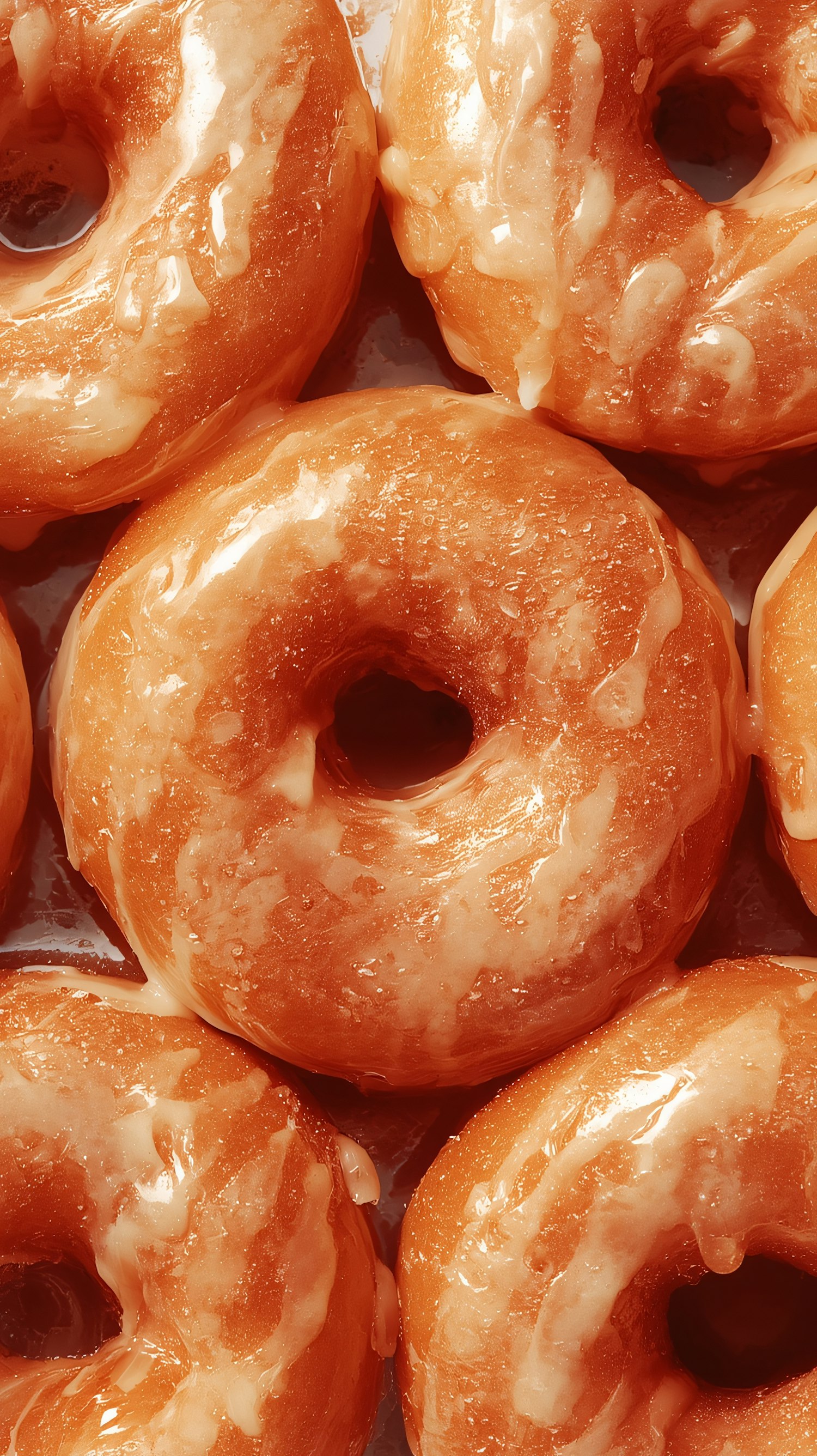Close-up of golden-brown glazed donuts with a shiny, smooth coating, arranged closely together for a delicious visual appeal.