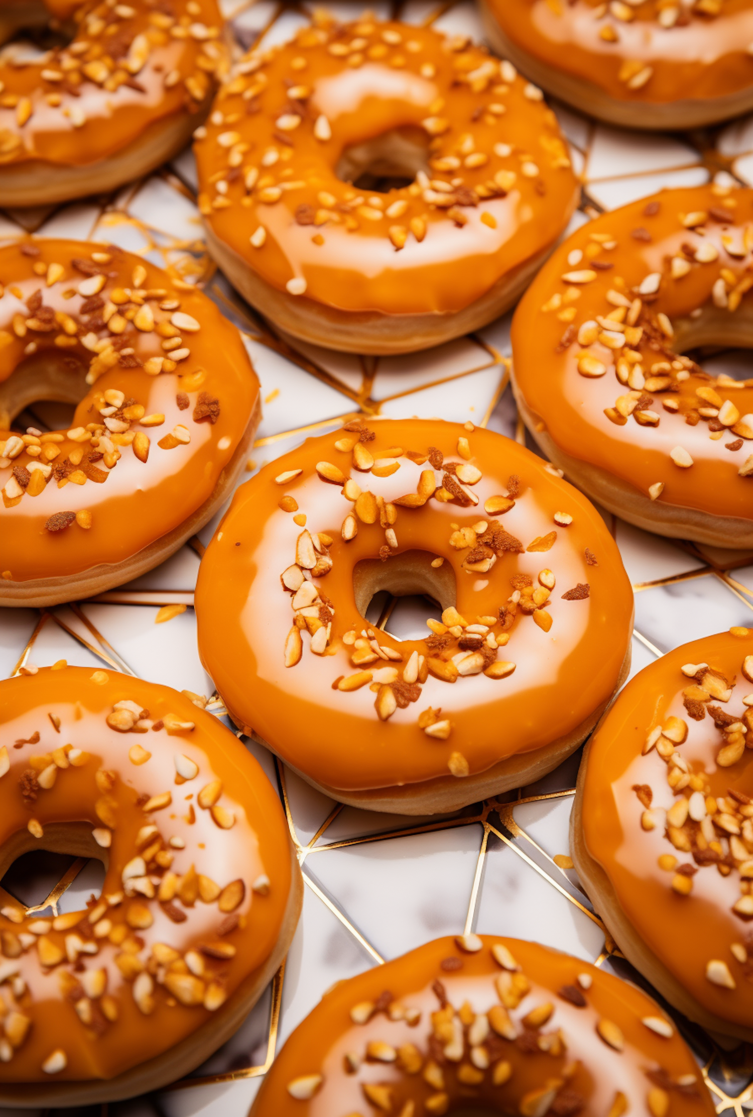 Delicious caramel-glazed donuts topped with crushed nuts on a stylish wire rack.