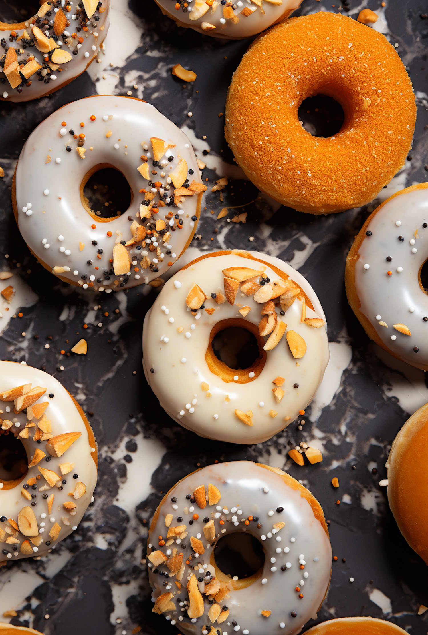 Delicious glazed donuts with nuts and sprinkles on a marbled surface, featuring a standout orange-coated donut.