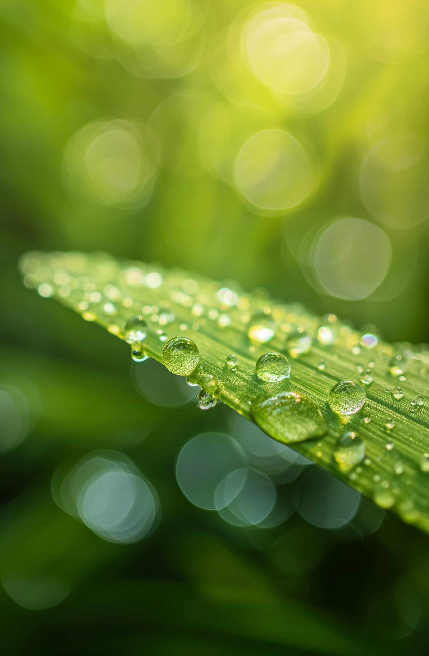 Close-up of a green leaf with glistening water droplets against a blurred green and yellow bokeh background.